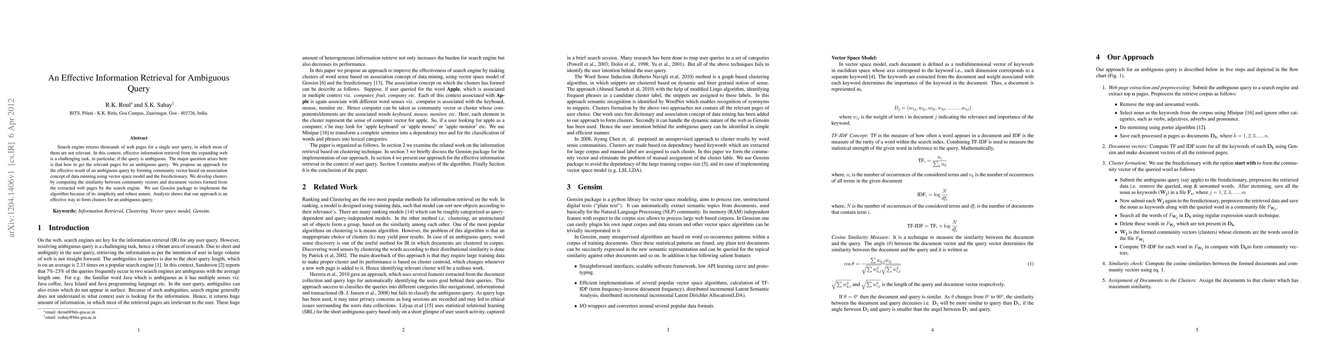 Search engine returns thousands of web pages for a single user query, in which most of them are not relevant. In this context, effective information retrieval from the expanding web is a challenging task, in particular, if the query is ambiguous. The major question arises here is that how to get the relevant pages for an ambiguous query. We propose an approach for the effective result of an ambiguous query by forming community vector based on association concept of data minning using vector space model and the freedictionary. We develop clusters by computing the similarity between community vectors and document vectors formed from the extracted web pages by the search engine. We use Gensim package to implement the algorithm because of its simplicity and robust nature. Analysis shows that our approach is an effective way to form clusters for an ambiguous query.