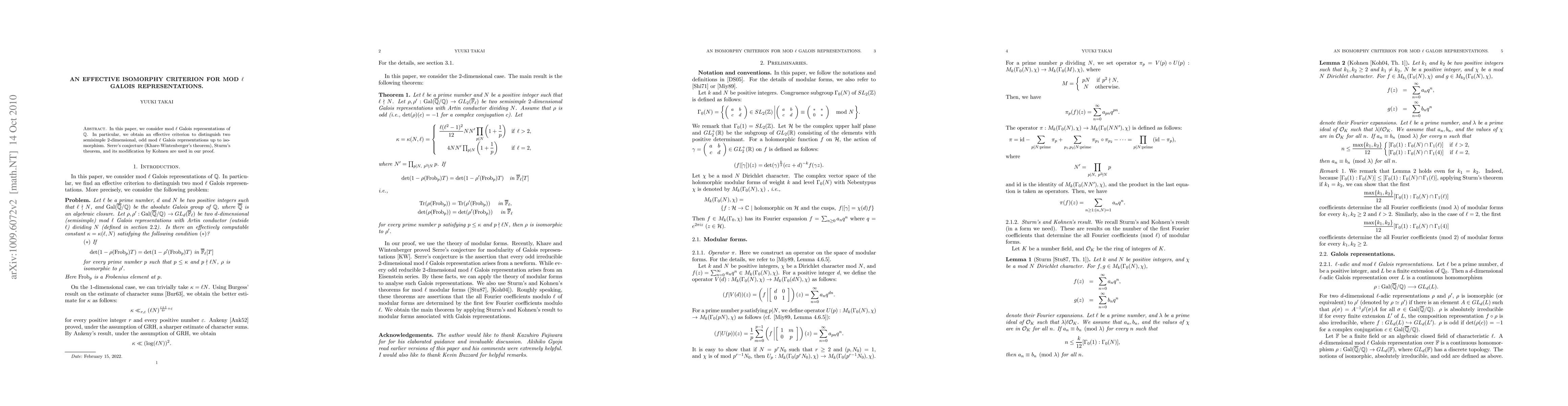 This paper provides an effective criterion for distinguishing semisimple 2-dimensional, odd mod $\ell$ Galois representations of $\mathbb{Q}$ up to isomorphism, utilizing results from Serre's conjecture, Sturm's theorem, and Kohnen's modifications.