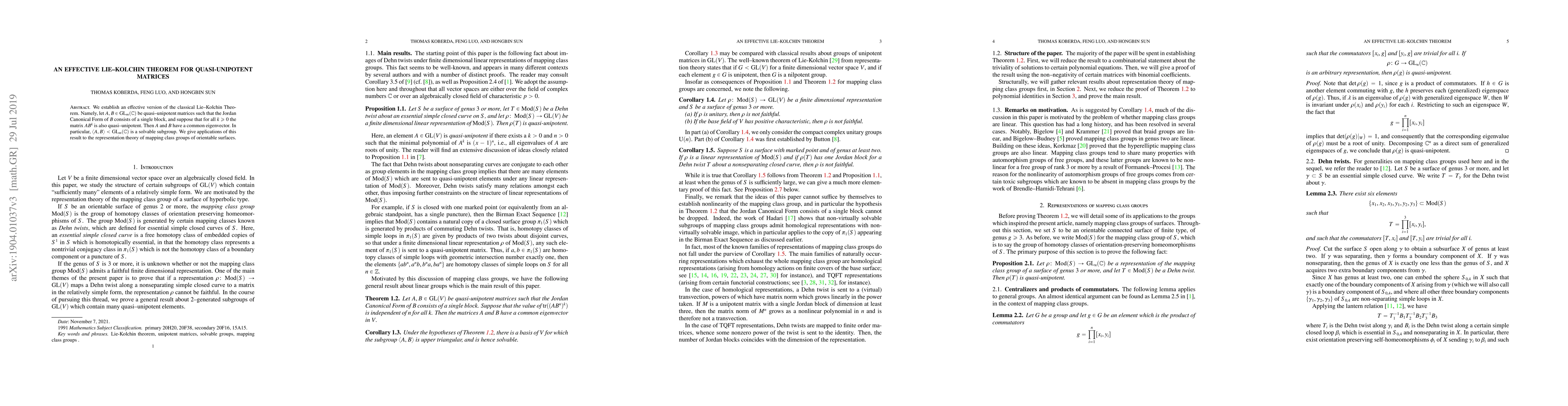We establish an effective version of the classical Lie--Kolchin Theorem. Namely, let $A,B\in\mathrm{GL}_m(\mathbb{C})$ be quasi--unipotent matrices such that the Jordan Canonical Form of $B$ consists of a single block, and suppose that for all $k\geq0$ the matrix $AB^k$ is also quasi--unipotent. Then $A$ and $B$ have a common eigenvector. In particular, $\langle A,B\rangle<\mathrm{GL}_m(\mathbb{C})$ is a solvable subgroup. We give applications of this result to the representation theory of mapping class groups of orientable surfaces.