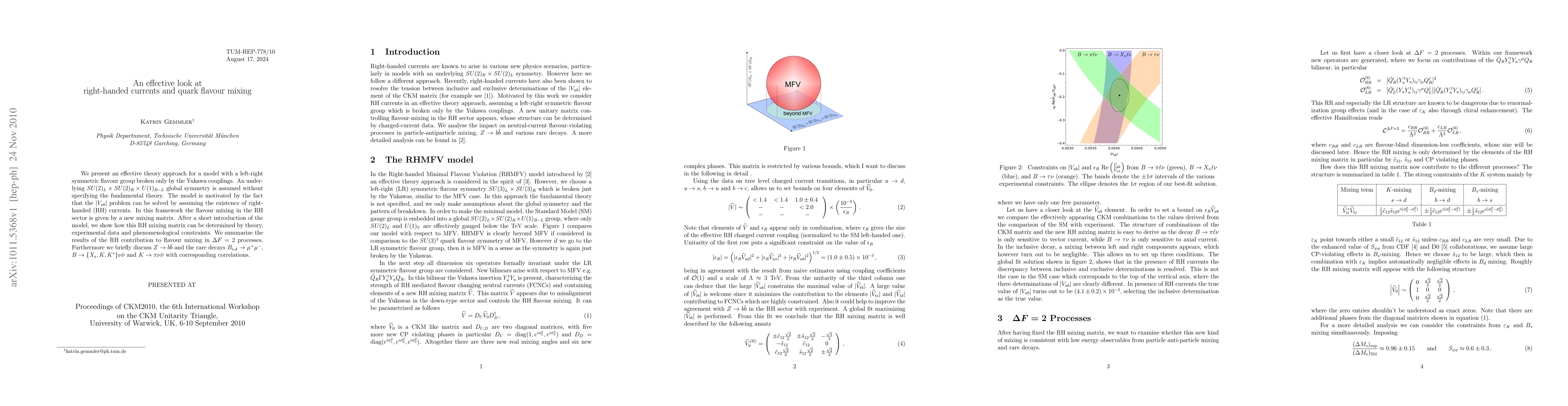 We present an effective theory approach for a model with a left-right symmetric flavour group broken only by the Yukawa couplings. An underlying SU(2)_L x SU(2)_R x U(1)_{B-L} global symmetry is assumed without specifying the fundamental theory. The model is motivated by the fact that the |V_{ub}| problem can be solved by assuming the existence of right-handed (RH) currents. In this framework the flavour mixing in the RH sector is given by a new mixing matrix. After a short introduction of the model, we show how this RH mixing matrix can be determined by theory, experimental data and phenomenological constraints. We summarize the results of the RH contribution to flavour mixing in Delta F=2 processes. Furthermore we briefly discuss Z -> b bbar and the rare decays B_{s,d} -> mu+ mu-, B -> {X_s,K,K*} nu nubar and K -> pi nu nubar with corresponding correlations.