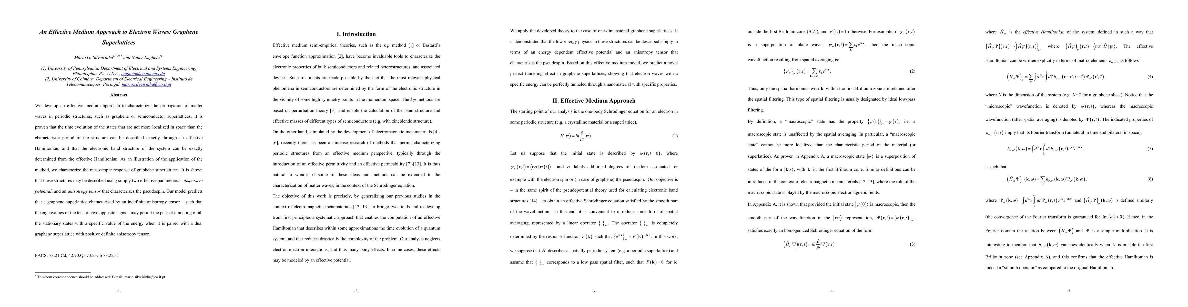 We develop an effective medium approach to characterize the propagation of matter waves in periodic structures, such as graphene or semiconductor superlattices. It is proven that the time evolution of the states that are not more localized in space than the characteristic period of the structure can be described exactly through an effective Hamiltonian, and that the electronic band structure of the system can be exactly determined from the effective Hamiltonian. As an illustration of the application of the method, we characterize the mesoscopic response of graphene superlattices. It is shown that these structures may be described using simply two effective parameters: a dispersive potential, and an anisotropy tensor that characterizes the pseudospin. Our model predicts that a graphene superlattice characterized by an indefinite anisotropy tensor - such that the eigenvalues of the tensor have opposite signs - may permit the perfect tunneling of all the stationary states with a specific value of the energy when it is paired with a dual graphene superlattice with positive definite anisotropy tensor.