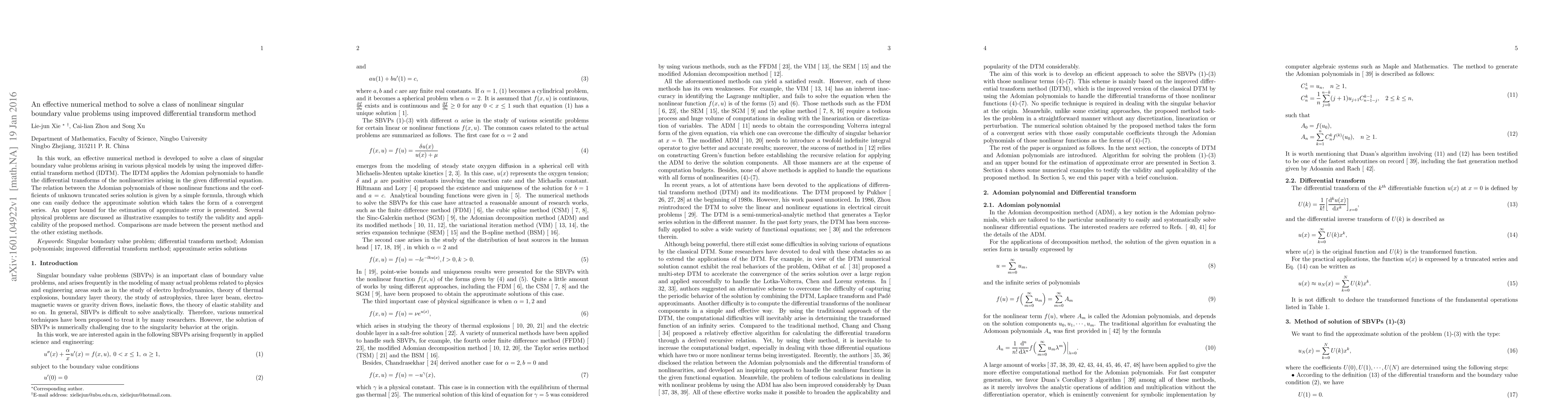 In this work, an effective numerical method is developed to solve a class of singular boundary value problems arising in various physical models by using the improved differential transform method (IDTM). The IDTM applies the Adomian polynomials to handle the differential transforms of the nonlinearities arising in the given differential equation. The relation between the Adomian polynomials of those nonlinear functions and the coefficients of unknown truncated series solution is given by a simple formula, through which one can easily deduce the approximate solution which takes the form of a convergent series. An upper bound for the estimation of approximate error is presented. Several physical problems are discussed as illustrative examples to testify the validity and applicability of the proposed method. Comparisons are made between the present method and the other existing methods.
