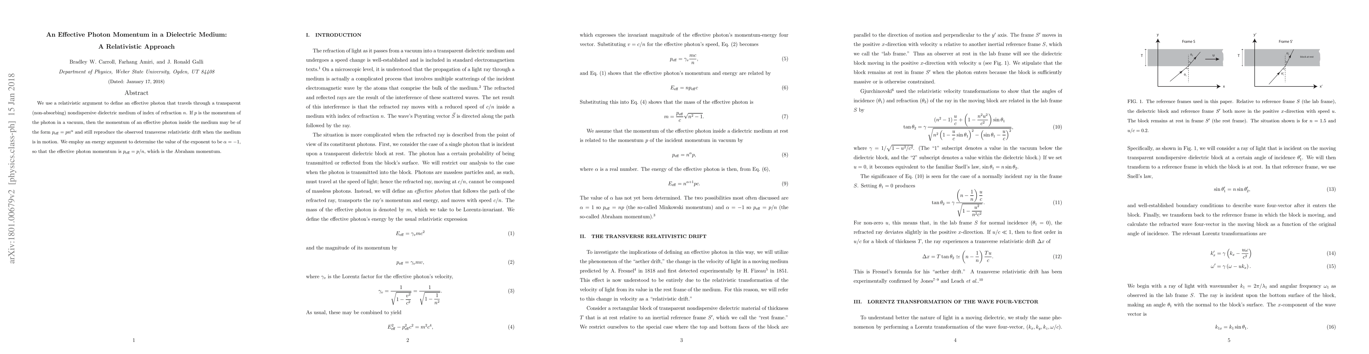 We use a relativistic argument to define an effective photon that travels through a transparent (non-absorbing) nondispersive dielectric medium of index of refraction $n$. If $p$ is the momentum of the photon in a vacuum, then the momentum of an effective photon inside the medium may be of the form $p_{\rm eff}=pn^\alpha$ and still reproduce the observed transverse relativistic drift when the medium is in motion. We employ an energy argument to determine the value of the exponent to be $\alpha =-1$, so that the effective photon momentum is $p_{\rm eff}=p/n$, which is the Abraham momentum.