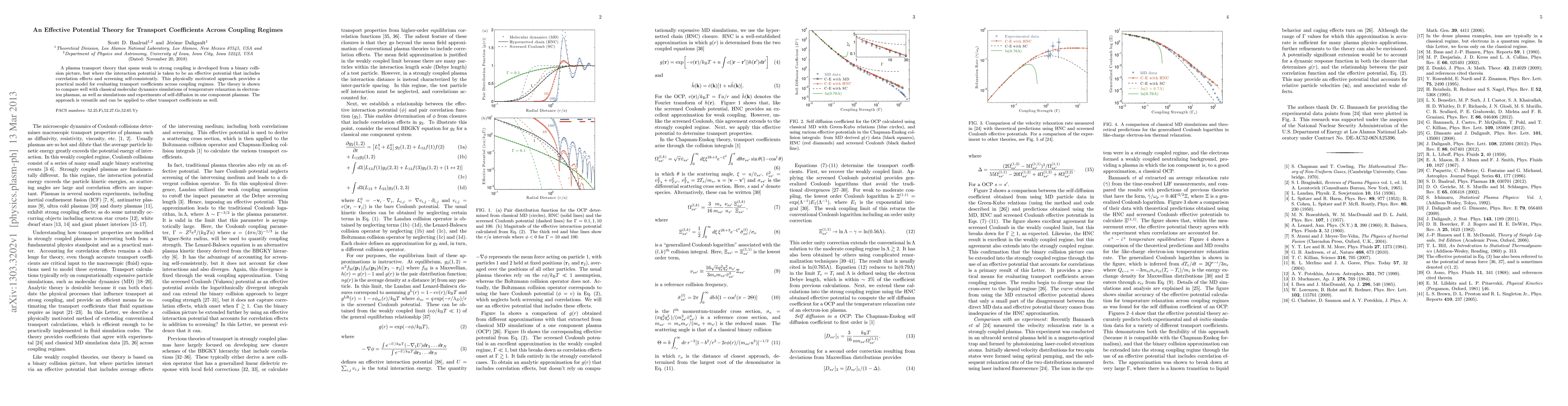 This paper develops a transport theory for plasmas that spans weak to strong coupling using effective potentials to incorporate correlation effects and screening. The proposed model effectively evaluates transport coefficients and aligns well with molecular dynamics simulations and experiments.