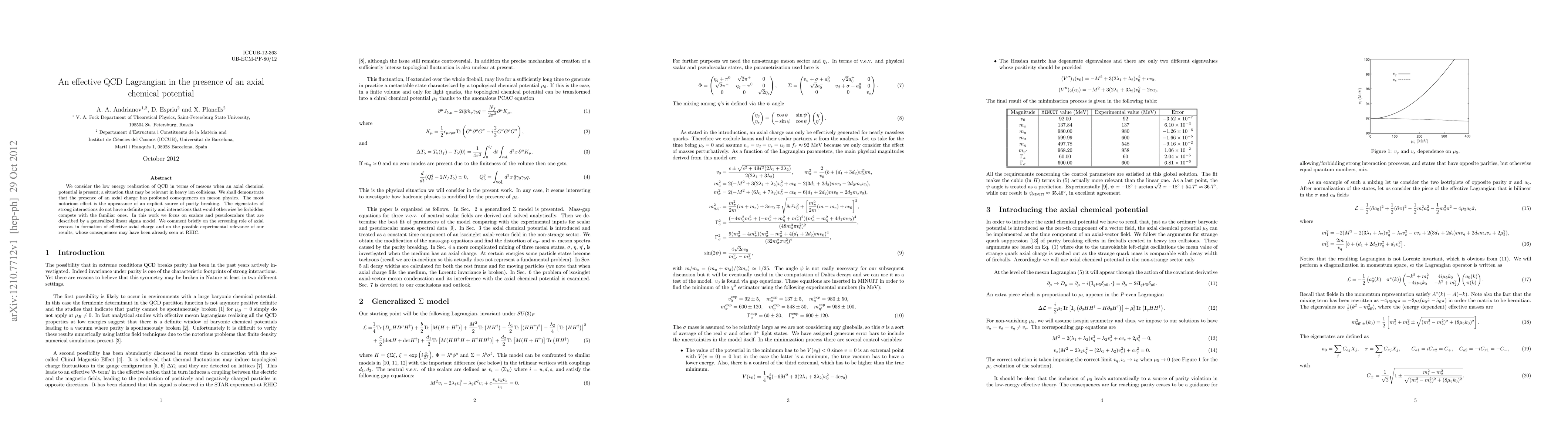 We consider the low energy realization of QCD in terms of mesons when an axial chemical potential is present; a situation that may be relevant in heavy ion collisions. We shall demonstrate that the presence of an axial charge has profound consequences on meson physics. The most notorious effect is the appearance of an explicit source of parity breaking. The eigenstates of strong interactions do not have a definite parity and interactions that would otherwise be forbidden compete with the familiar ones. In this work we focus on scalars and pseudoscalars that are described by a generalized linear sigma model. We comment briefly on the screening role of axial vectors in formation of effective axial charge and on the possible experimental relevance of our results, whose consequences may have been already seen at RHIC.