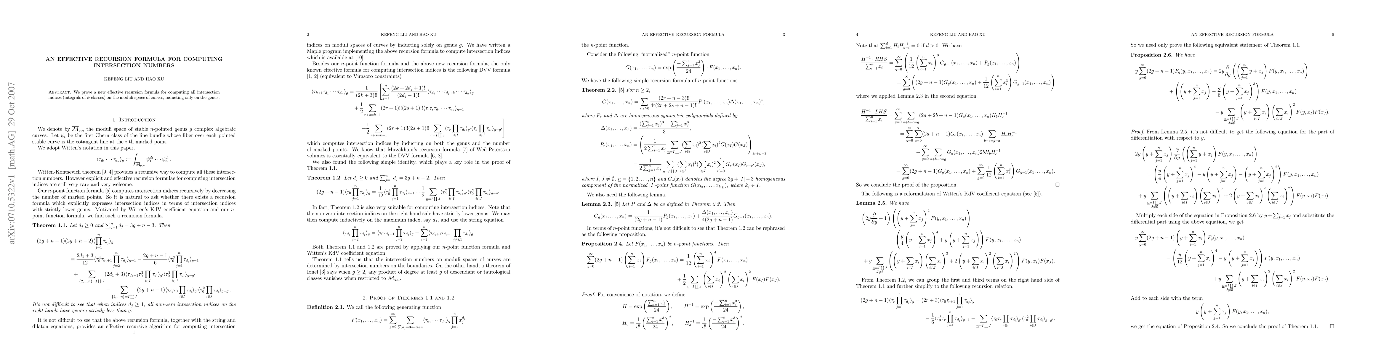 We prove a new effective recursion formula for computing all intersection indices (integrals of $\psi$ classes) on the moduli space of curves, inducting only on the genus.