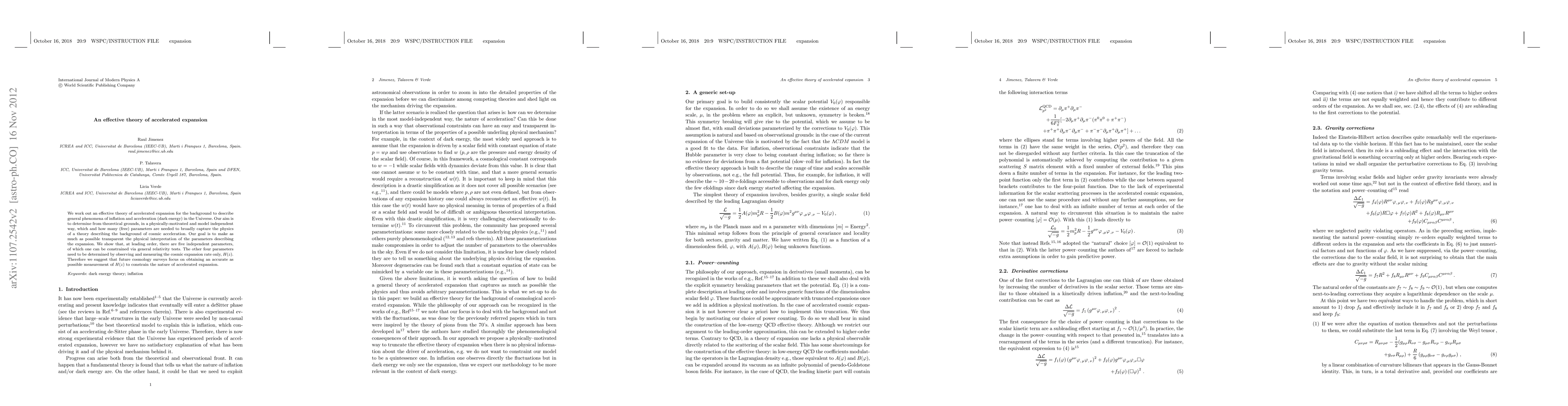 We work out an effective theory of accelerated expansion to describe general phenomena of inflation and acceleration (dark energy) in the Universe. Our aim is to determine from theoretical grounds, in a physically-motivated and model independent way, which and how many (free) parameters are needed to broadly capture the physics of a theory describing cosmic acceleration. Our goal is to make as much as possible transparent the physical interpretation of the parameters describing the expansion. We show that, at leading order, there are five independent parameters, of which one can be constrained via general relativity tests. The other four parameters need to be determined by observing and measuring the cosmic expansion rate only, H(z). Therefore we suggest that future cosmology surveys focus on obtaining an accurate as possible measurement of $H(z)$ to constrain the nature of accelerated expansion (dark energy and/or inflation).