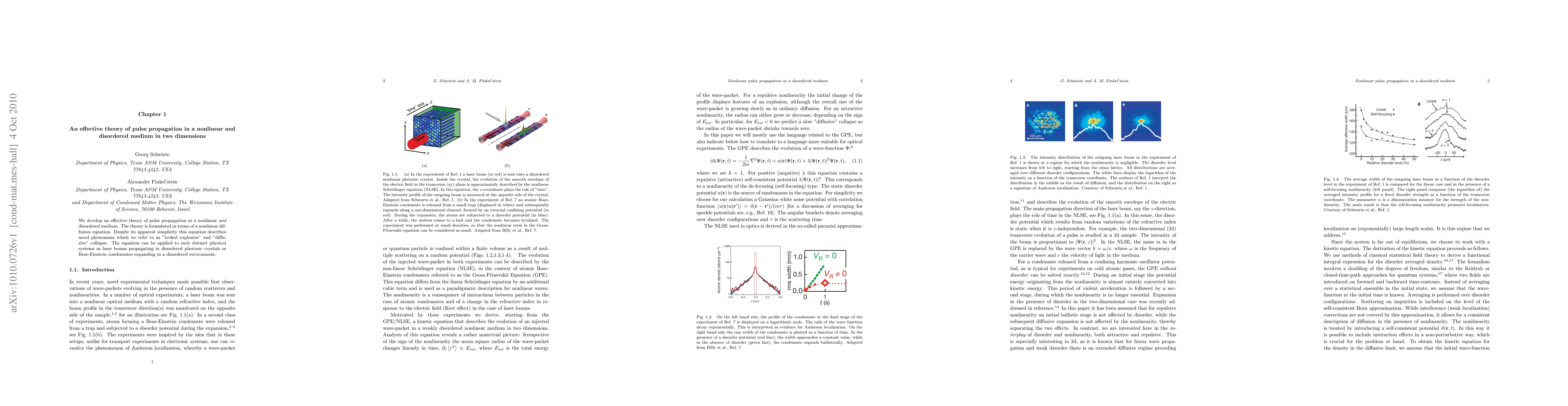 This paper develops an effective theory for pulse propagation in nonlinear and disordered two-dimensional media, formulated via a nonlinear diffusion equation that captures phenomena like "locked explosion" and "diffusive collapse." The theory applies to systems such as laser beams in photonic crystals and expanding Bose-Einstein condensates.