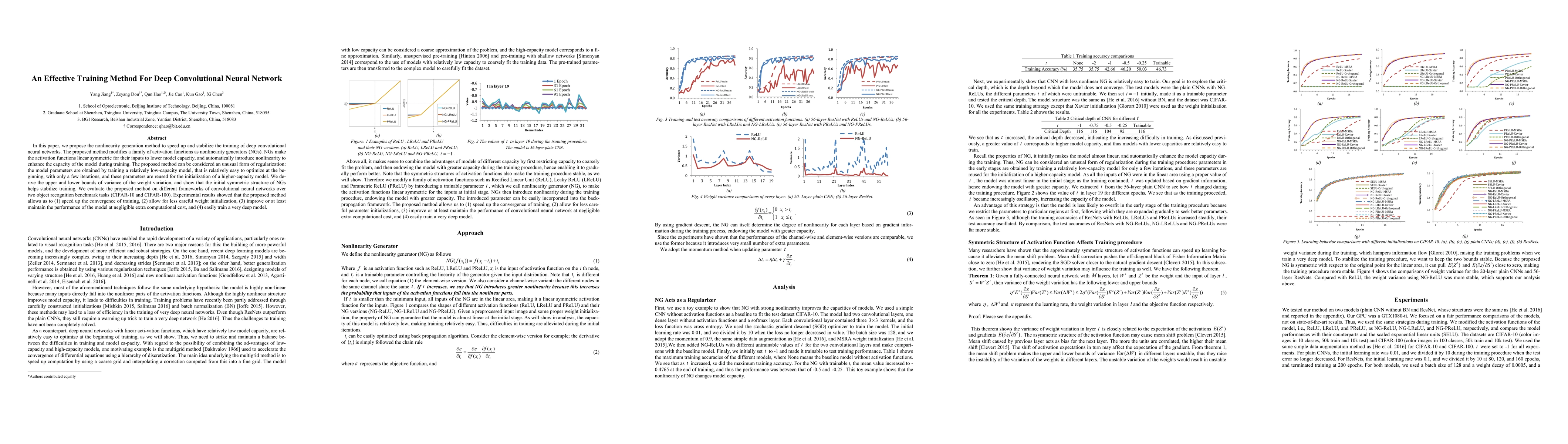 This paper introduces a novel training method for deep convolutional neural networks, called Nonlinearity Generation (NG). NG modifies activation functions to reduce model capacity initially, then introduces nonlinearity during training. This method speeds up convergence, requires less careful weight initialization, maintains model performance with negligible extra cost, and facilitates training of very deep models.