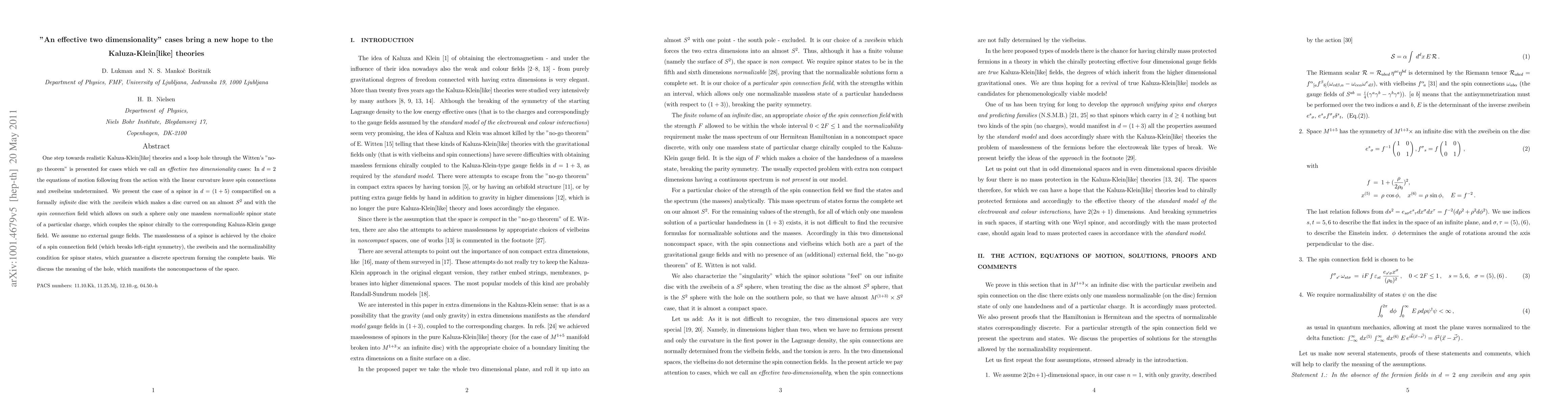 One step towards realistic Kaluza-Klein[like] theories and a loop hole through the Witten's "no-go theorem" is presented for cases which we call an effective two dimensionality cases: In $d=2$ the equations of motion following from the action with the linear curvature leave spin connections and zweibeins undetermined. We present the case of a spinor in $d=(1+5)$ compactified on a formally infinite disc with the zweibein which makes a disc curved on an almost $S^2$ and with the spin connection field which allows on such a sphere only one massless normalizable spinor state of a particular charge, which couples the spinor chirally to the corresponding Kaluza-Klein gauge field. We assume no external gauge fields. The masslessness of a spinor is achieved by the choice of a spin connection field (which breaks parity), the zweibein and the normalizability condition for spinor states, which guarantee a discrete spectrum forming the complete basis. We discuss the meaning of the hole, which manifests the noncompactness of the space.