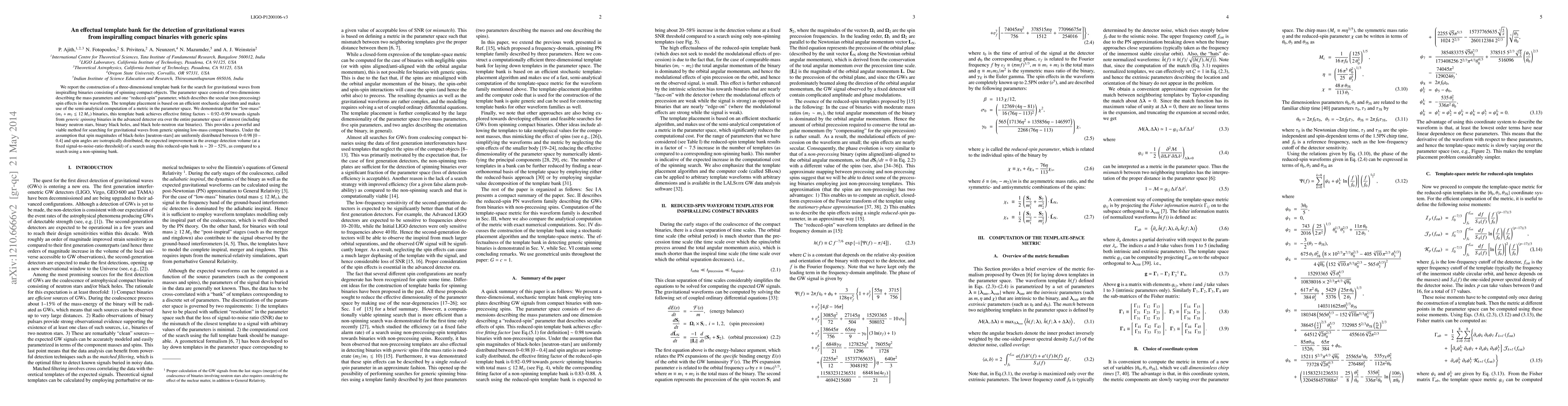 This paper constructs a three-dimensional template bank for detecting gravitational waves from spinning compact binaries, achieving high fitting factors for low-mass binaries. The template bank improves detection volume by 20-52% compared to non-spinning banks, enhancing searches for generic spinning binaries.