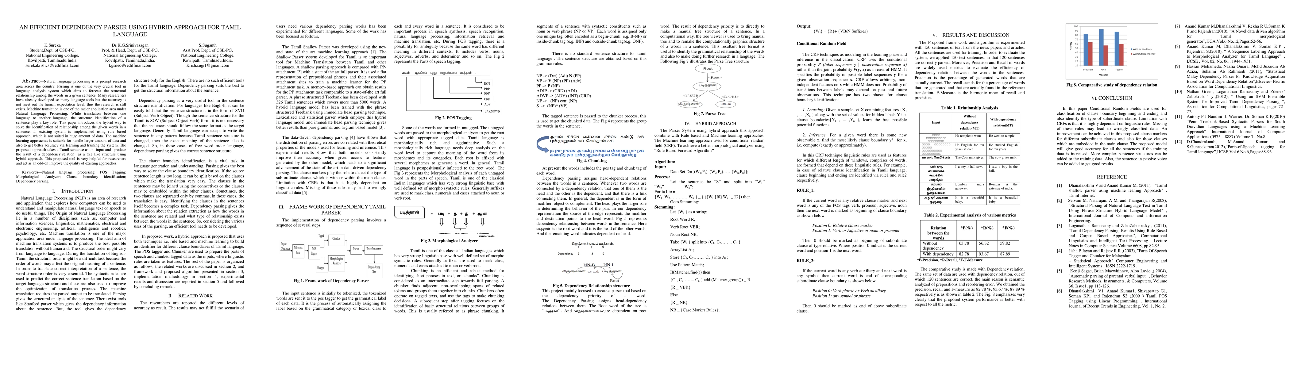 Natural language processing is a prompt research area across the country. Parsing is one of the very crucial tool in language analysis system which aims to forecast the structural relationship among the words in a given sentence. Many researchers have already developed so many language tools but the accuracy is not meet out the human expectation level, thus the research is still exists. Machine translation is one of the major application area under Natural Language Processing. While translation between one language to another language, the structure identification of a sentence play a key role. This paper introduces the hybrid way to solve the identification of relationship among the given words in a sentence. In existing system is implemented using rule based approach, which is not suited in huge amount of data. The machine learning approaches is suitable for handle larger amount of data and also to get better accuracy via learning and training the system. The proposed approach takes a Tamil sentence as an input and produce the result of a dependency relation as a tree like structure using hybrid approach. This proposed tool is very helpful for researchers and act as an odd-on improve the quality of existing approaches.