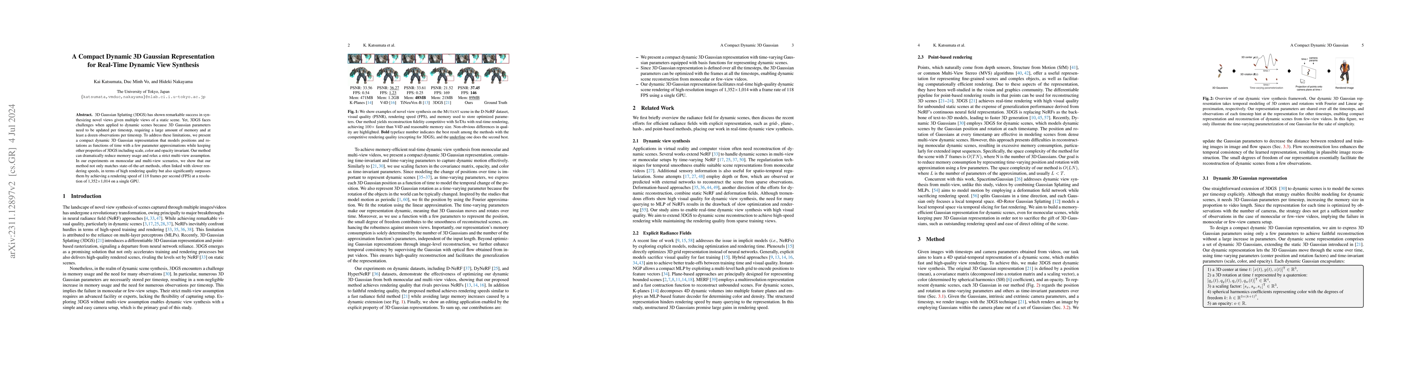 In novel view synthesis of scenes from multiple input views, 3D Gaussian splatting emerges as a viable alternative to existing radiance field approaches, delivering great visual quality and real-time rendering. While successful in static scenes, the present advancement of 3D Gaussian representation, however, faces challenges in dynamic scenes in terms of memory consumption and the need for numerous observations per time step, due to the onus of storing 3D Gaussian parameters per time step. In this study, we present an efficient 3D Gaussian representation tailored for dynamic scenes in which we define positions and rotations as functions of time while leaving other time-invariant properties of the static 3D Gaussian unchanged. Notably, our representation reduces memory usage, which is consistent regardless of the input sequence length. Additionally, it mitigates the risk of overfitting observed frames by accounting for temporal changes. The optimization of our Gaussian representation based on image and flow reconstruction results in a powerful framework for dynamic scene view synthesis in both monocular and multi-view cases. We obtain the highest rendering speed of $118$ frames per second (FPS) at a resolution of $1352 \times 1014$ with a single GPU, showing the practical usability and effectiveness of our proposed method in dynamic scene rendering scenarios.
