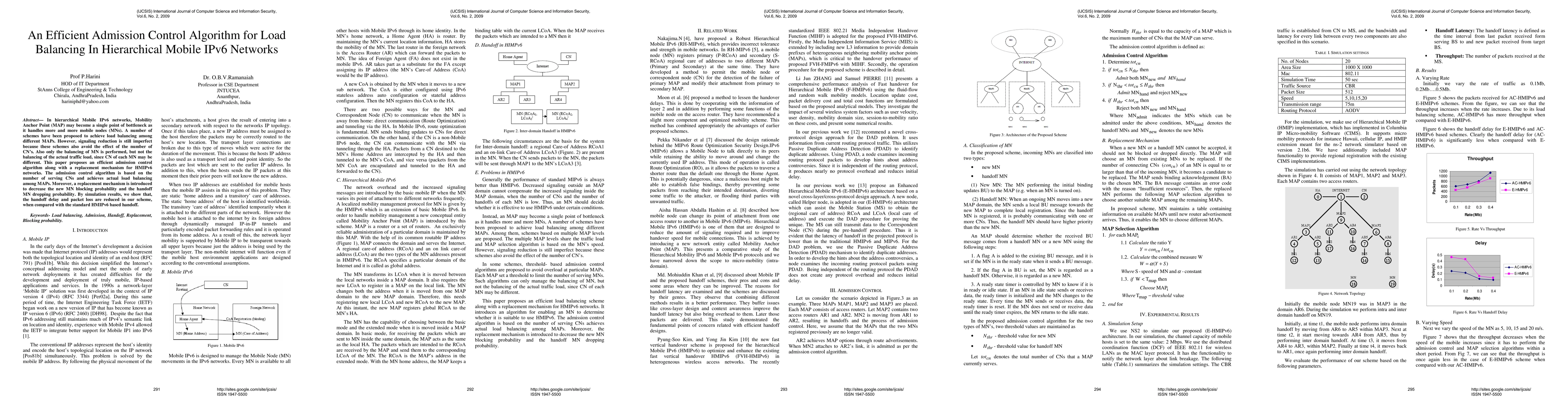This paper proposes an efficient admission control algorithm for hierarchical Mobile IPv6 networks to balance load among Mobility Anchor Points (MAPs) based on the number of serving content nodes (CNs), achieving better traffic load balancing. The algorithm also introduces a replacement mechanism to reduce blocking and dropping probabilities, resulting in lower handoff delay and packet loss compared to standard HMIPv6.
