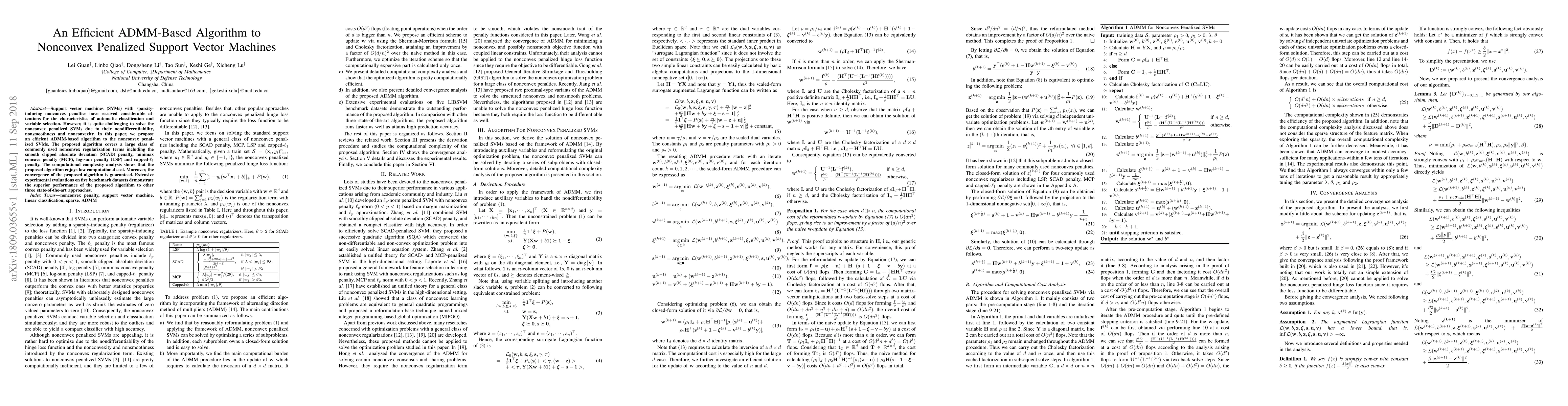 This paper proposes an efficient ADMM-based algorithm for solving nonconvex penalized support vector machines, addressing their nondifferentiability and nonconvexity. The algorithm is shown to have low computational cost and is effective across various nonconvex regularization terms, outperforming other state-of-the-art methods in experiments.