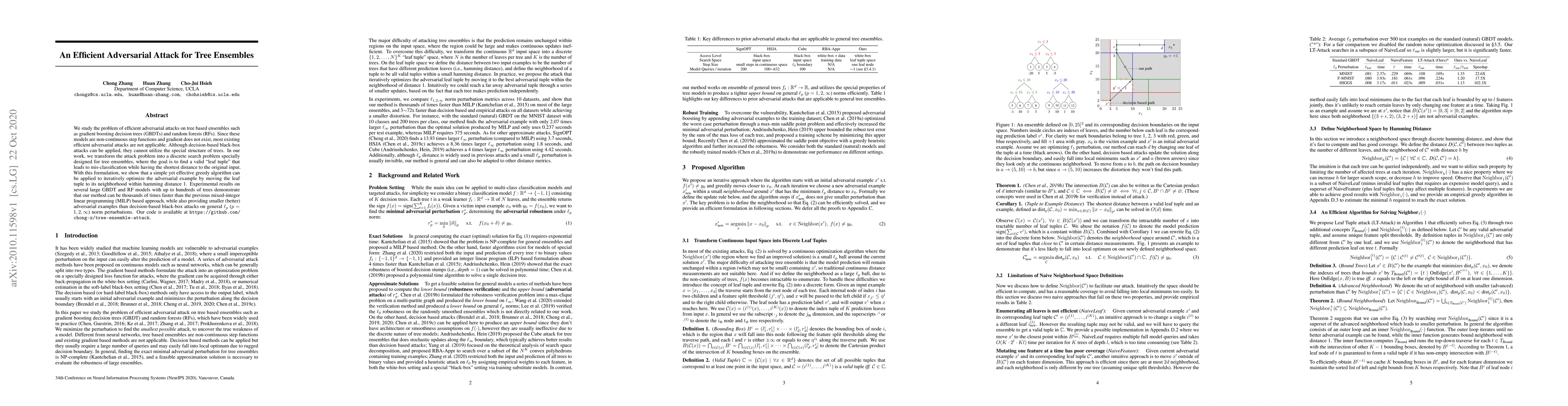 This paper proposes an efficient adversarial attack method specifically designed for tree ensemble models like GBDTs and RFs. It formulates the attack as a discrete search problem focusing on finding a minimal perturbation that misclassifies the input, using a fast greedy algorithm that significantly outperforms previous MILP-based methods.