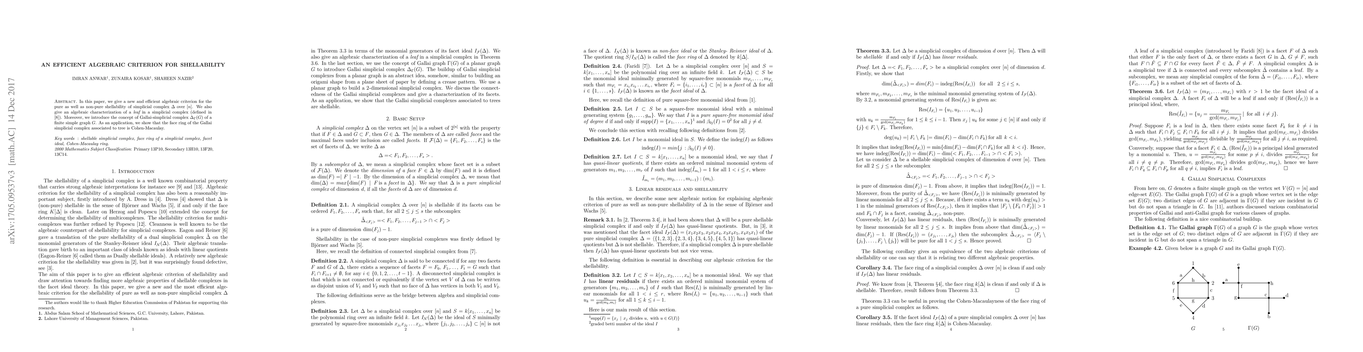 In this paper, we give a new and efficient algebraic criterion for the pure as well as non-pure shellability of simplicial complex $\Delta$ over [n]. We also give an algebraic characterization of a leaf in a simplicial complex (defined in [8]). Moreover, we introduce the concept of Gallai-simplicial complex $\Delta_{\Gamma}(G)$ of a finite simple graph G. As an application, we show that the face ring of the Gallai simplicial complex associated to tree is Cohen-Macaulay.