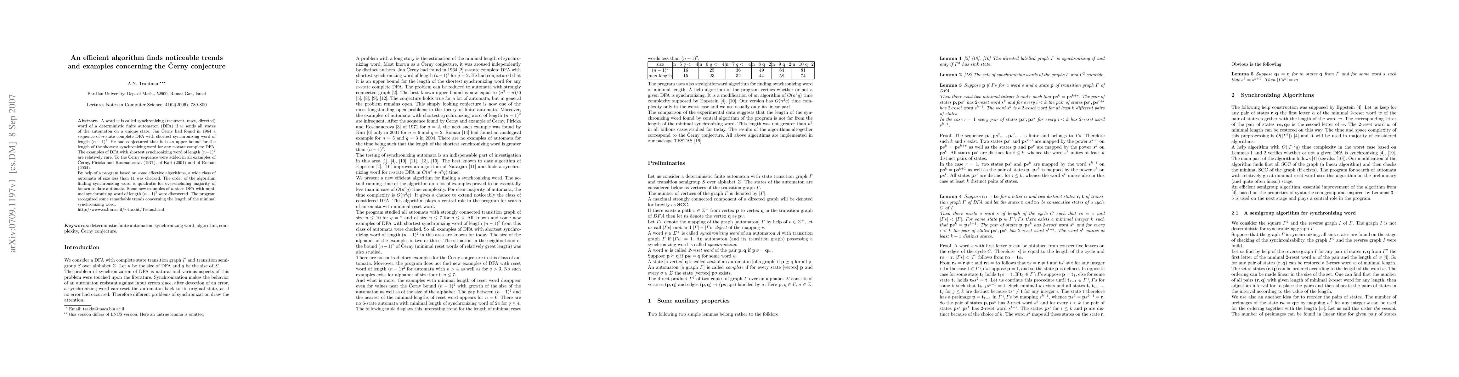 A word w is called synchronizing (recurrent, reset, directed) word of a deterministic finite automaton (DFA) if w sends all states of the automaton on a unique state. Jan Cerny had found in 1964 a sequence of n-state complete DFA with shortest synchronizing word of length (n-1)^2. He had conjectured that it is an upper bound for the length of the shortest synchronizing word for any $n$-state complete DFA. The examples of DFA with shortest synchronizing word of length (n-1)^2 are relatively rare. To the Cerny sequence were added in all examples of Cerny, Piricka and Rosenauerova (1971), of Kari (2001) and of Roman (2004). By help of a program based on some effective algorithms, a wide class of automata of size less than 11 was checked. The order of the algorithm finding synchronizing word is quadratic for overwhelming majority of known to date automata. Some new examples of n-state DFA with minimal synchronizing word of length (n-1)^2 were discovered. The program recognized some remarkable trends concerning the length of the minimal synchronizing word. http://www.cs.biu.ac.il/~trakht/Testas.html