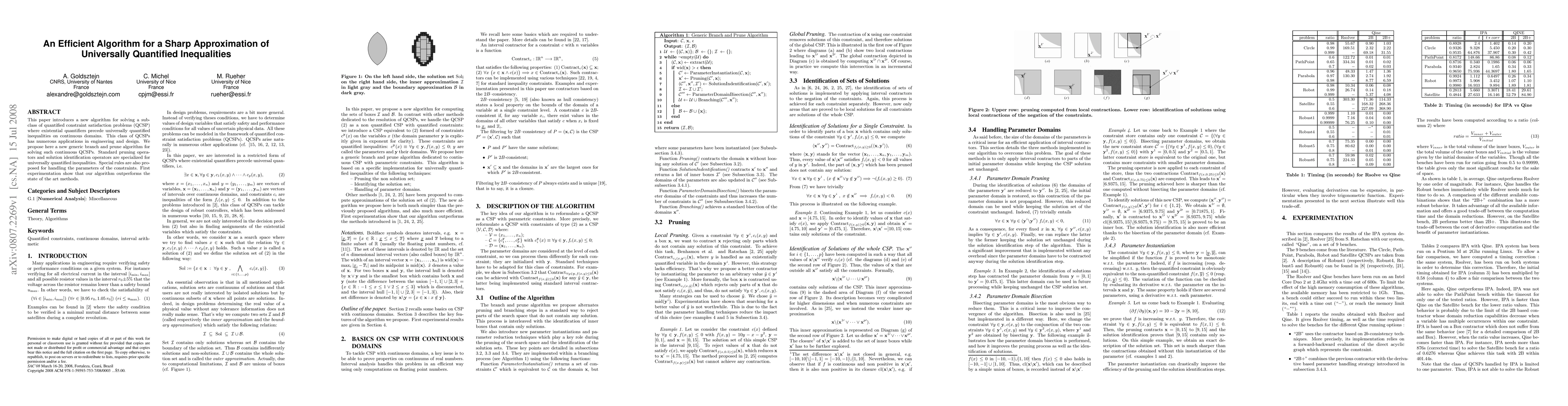 This paper introduces a new algorithm for solving a sub-class of quantified constraint satisfaction problems (QCSP) where existential quantifiers precede universally quantified inequalities on continuous domains. This class of QCSPs has numerous applications in engineering and design. We propose here a new generic branch and prune algorithm for solving such continuous QCSPs. Standard pruning operators and solution identification operators are specialized for universally quantified inequalities. Special rules are also proposed for handling the parameters of the constraints. First experimentation show that our algorithm outperforms the state of the art methods.