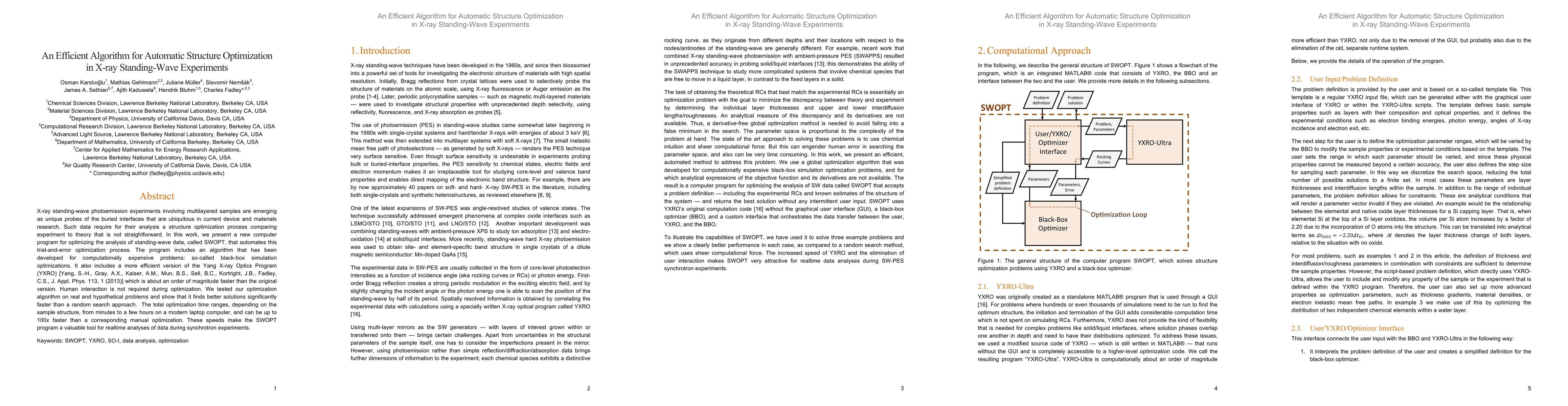 X-ray standing-wave photoemission experiments involving multilayered samples are emerging as unique probes of the buried interfaces that are ubiquitous in current device and materials research. Such data require for their analysis a structure optimization process comparing experiment to theory that is not straightforward. In this work, we present a new computer program for optimizing the analysis of standing-wave data, called SWOPT, that automates this trial-and-error optimization process. The program includes an algorithm that has been developed for computationally expensive problems: so-called black-box simulation optimizations. It also includes a more efficient version of the Yang X-ray Optics Program (YXRO) [Yang, S.-H., Gray, A.X., Kaiser, A.M., Mun, B.S., Sell, B.C., Kortright, J.B., Fadley, C.S., J. Appl. Phys. 113, 1 (2013)] which is about an order of magnitude faster than the original version. Human interaction is not required during optimization. We tested our optimization algorithm on real and hypothetical problems and show that it finds better solutions significantly faster than a random search approach. The total optimization time ranges, depending on the sample structure, from minutes to a few hours on a modern laptop computer, and can be up to 100x faster than a corresponding manual optimization. These speeds make the SWOPT program a valuable tool for realtime analyses of data during synchrotron experiments.