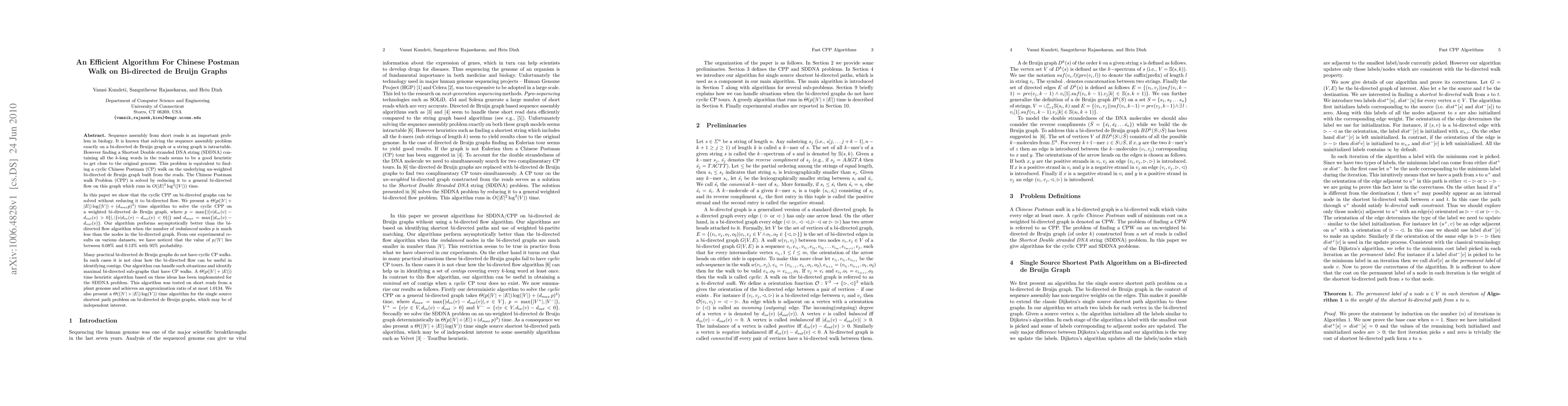 Sequence assembly from short reads is an important problem in biology. It is known that solving the sequence assembly problem exactly on a bi-directed de Bruijn graph or a string graph is intractable. However finding a Shortest Double stranded DNA string (SDDNA) containing all the k-long words in the reads seems to be a good heuristic to get close to the original genome. This problem is equivalent to finding a cyclic Chinese Postman (CP) walk on the underlying un-weighted bi-directed de Bruijn graph built from the reads. The Chinese Postman walk Problem (CPP) is solved by reducing it to a general bi-directed flow on this graph which runs in O(|E|2 log2(|V |)) time. In this paper we show that the cyclic CPP on bi-directed graphs can be solved without reducing it to bi-directed flow. We present a ?(p(|V | + |E|) log(|V |) + (dmaxp)3) time algorithm to solve the cyclic CPP on a weighted bi-directed de Bruijn graph, where p = max{|{v|din(v) - dout(v) > 0}|, |{v|din(v) - dout(v) < 0}|} and dmax = max{|din(v) - dout(v)}. Our algorithm performs asymptotically better than the bidirected flow algorithm when the number of imbalanced nodes p is much less than the nodes in the bi-directed graph. From our experimental results on various datasets, we have noticed that the value of p/|V | lies between 0.08% and 0.13% with 95% probability.