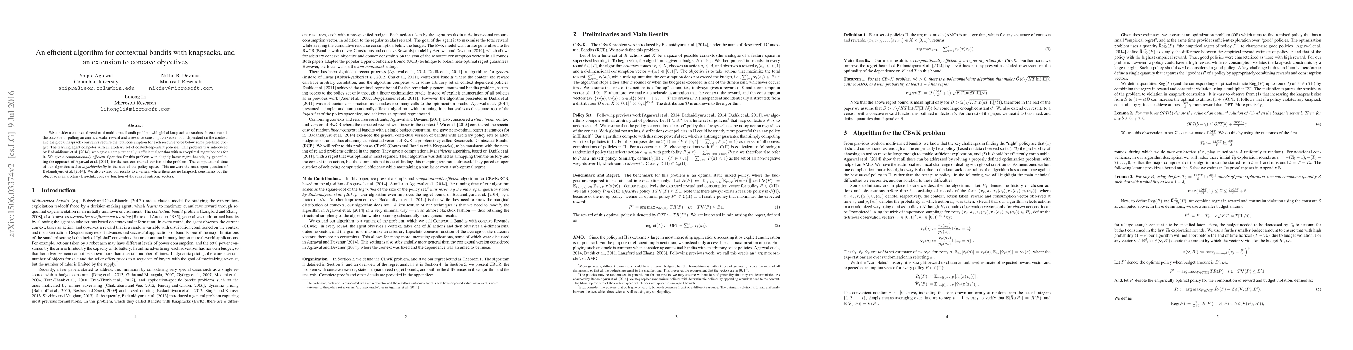 We consider a contextual version of multi-armed bandit problem with global knapsack constraints. In each round, the outcome of pulling an arm is a scalar reward and a resource consumption vector, both dependent on the context, and the global knapsack constraints require the total consumption for each resource to be below some pre-fixed budget. The learning agent competes with an arbitrary set of context-dependent policies. This problem was introduced by Badanidiyuru et al. (2014), who gave a computationally inefficient algorithm with near-optimal regret bounds for it. We give a computationally efficient algorithm for this problem with slightly better regret bounds, by generalizing the approach of Agarwal et al. (2014) for the non-constrained version of the problem. The computational time of our algorithm scales logarithmically in the size of the policy space. This answers the main open question of Badanidiyuru et al. (2014). We also extend our results to a variant where there are no knapsack constraints but the objective is an arbitrary Lipschitz concave function of the sum of outcome vectors.