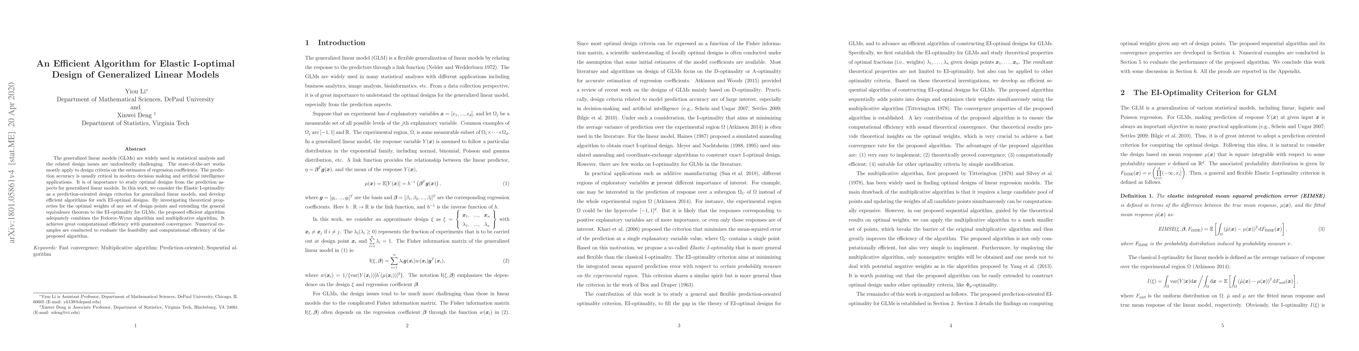 This paper develops efficient algorithms for Elastic I-optimal design of generalized linear models, focusing on prediction accuracy. The proposed method combines the Fedorov-Wynn algorithm and multiplicative algorithm, ensuring computational efficiency and convergence, as demonstrated by numerical examples.