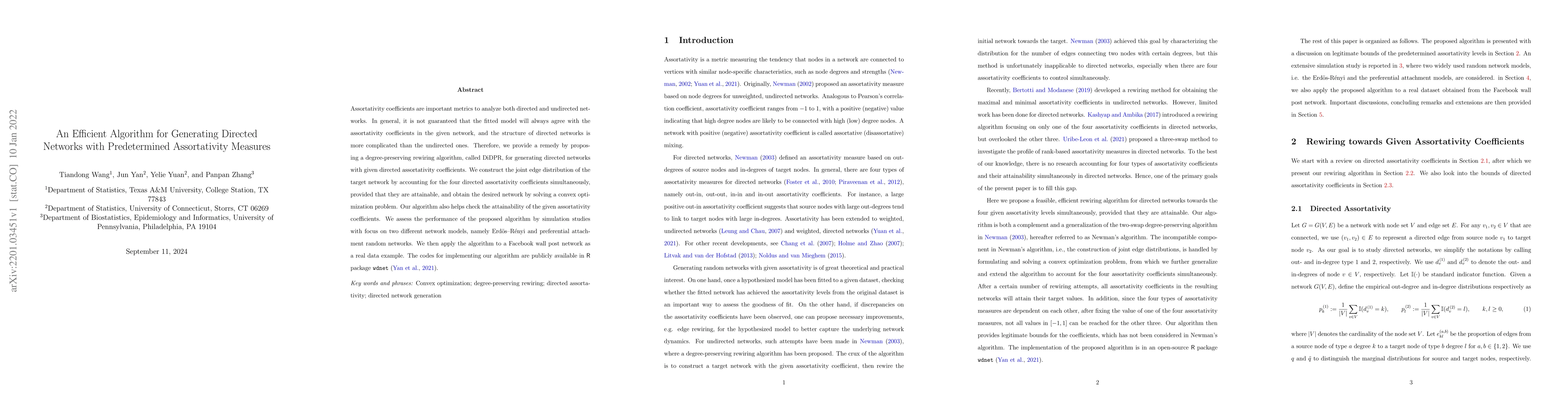 This paper proposes a degree-preserving rewiring algorithm, DiDPR, to generate directed networks with specified assortativity coefficients. The algorithm constructs the joint edge distribution and solves a convex optimization problem to achieve the desired network structure.