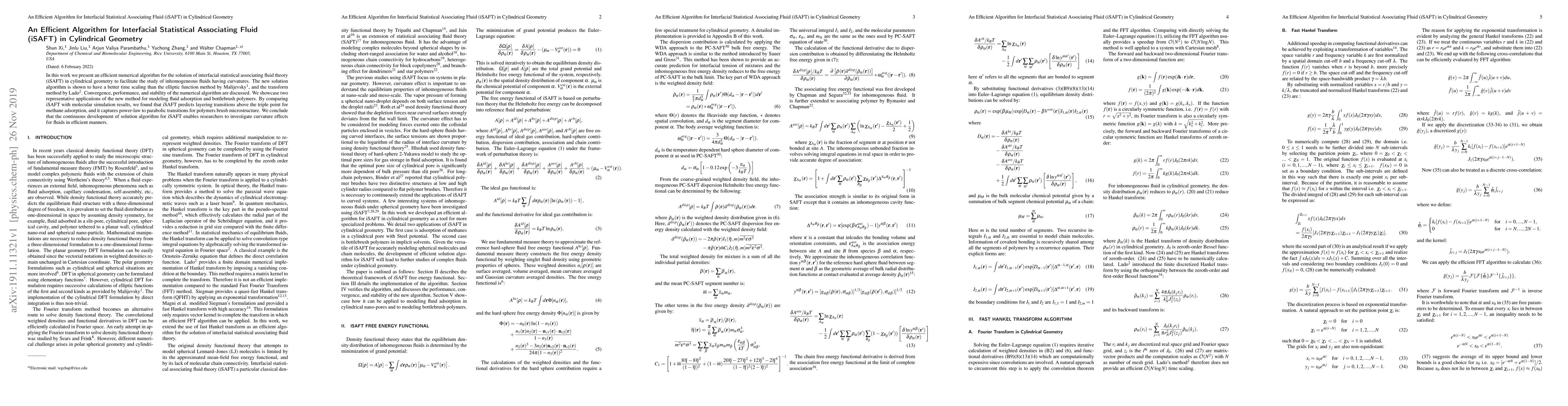In this work we present an efficient numerical algorithm for the solution of interfacial statistical associating fluid theory (iSAFT) in cylindrical geometry to facilitate the study of inhomogeneous fluids having curvatures. The new solution algorithm is shown to have a better time scaling than the elliptic function method by Malijevsky, and the transform method by Lado. Convergence, performance, and stability of the numerical algorithm are discussed. We showcase two representative applications of the new method for modeling fluid adsorption and bottlebrush polymers. By comparing iSAFT with molecular simulation results, we found that iSAFT predicts layering transitions above the triple point for methane adsorption, and it captures power-law to parabolic transitions for polymers brush microstructure. We conclude that the continuous development of solution algorithm for iSAFT enables researchers to investigate curvature effects for fluids in efficient manners.