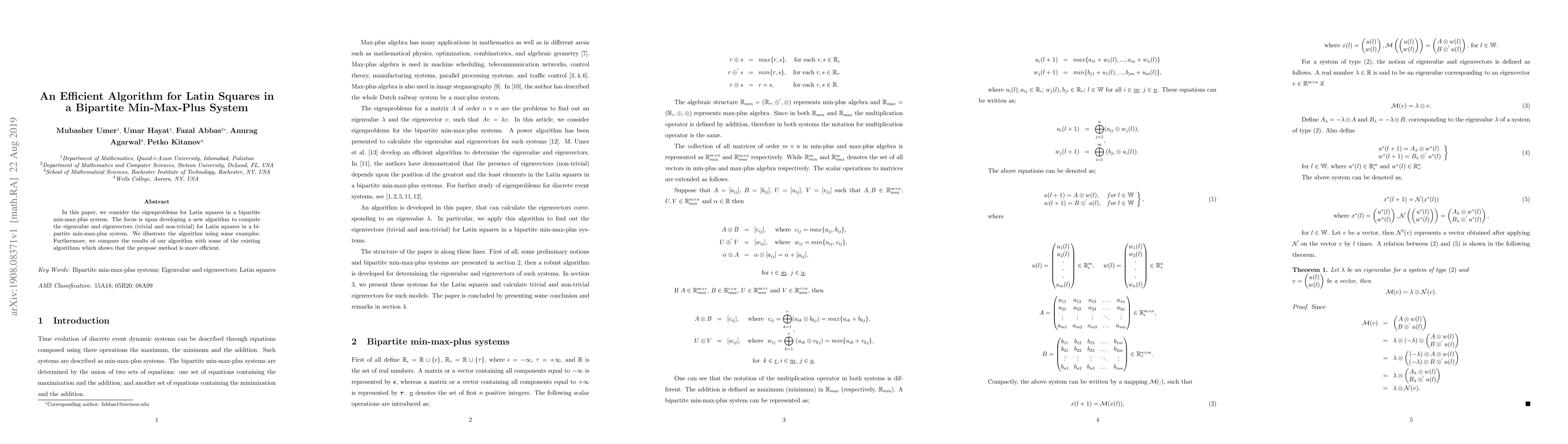 This paper introduces an efficient algorithm for computing eigenvalues and eigenvectors of Latin squares in a bipartite min-max-plus system, demonstrating its efficiency through comparisons with existing methods and example applications.