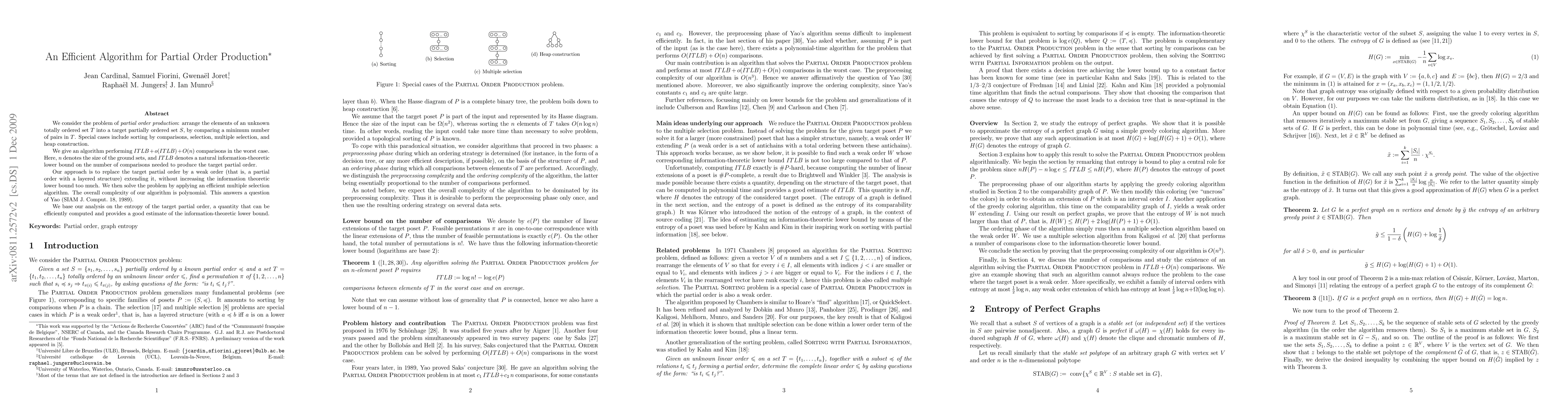 We consider the problem of partial order production: arrange the elements of an unknown totally ordered set T into a target partially ordered set S, by comparing a minimum number of pairs in T. Special cases include sorting by comparisons, selection, multiple selection, and heap construction. We give an algorithm performing ITLB + o(ITLB) + O(n) comparisons in the worst case. Here, n denotes the size of the ground sets, and ITLB denotes a natural information-theoretic lower bound on the number of comparisons needed to produce the target partial order. Our approach is to replace the target partial order by a weak order (that is, a partial order with a layered structure) extending it, without increasing the information theoretic lower bound too much. We then solve the problem by applying an efficient multiple selection algorithm. The overall complexity of our algorithm is polynomial. This answers a question of Yao (SIAM J. Comput. 18, 1989). We base our analysis on the entropy of the target partial order, a quantity that can be efficiently computed and provides a good estimate of the information-theoretic lower bound.