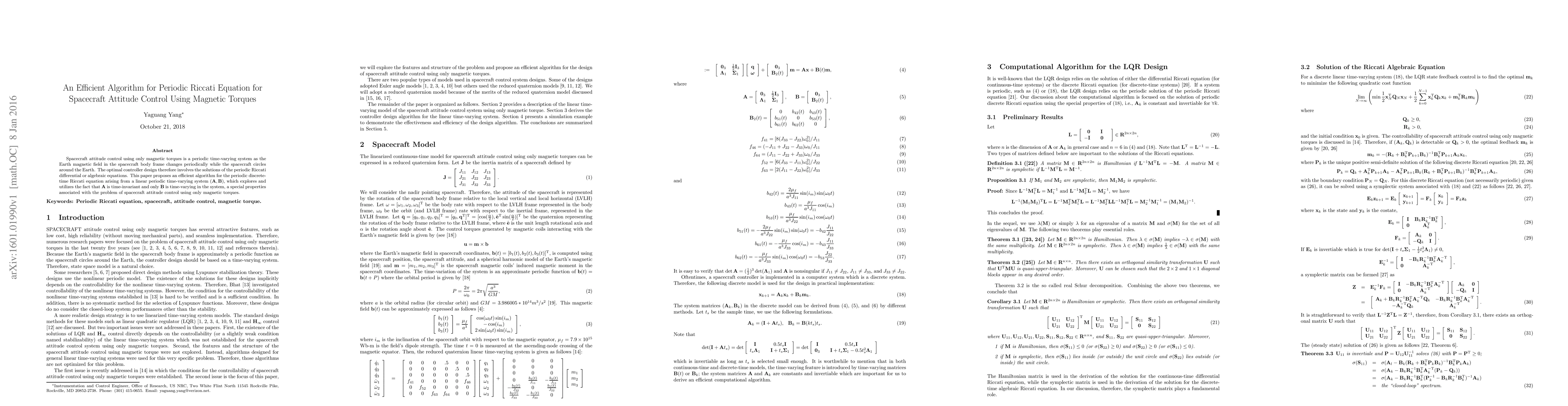 This paper proposes an efficient algorithm for solving the periodic discrete-time Riccati equation in spacecraft attitude control using magnetic torques, leveraging the time-invariant nature of the system matrix $\A$ and the time-varying nature of the input matrix $\B$. The method aims to optimize the controller design for periodic systems.