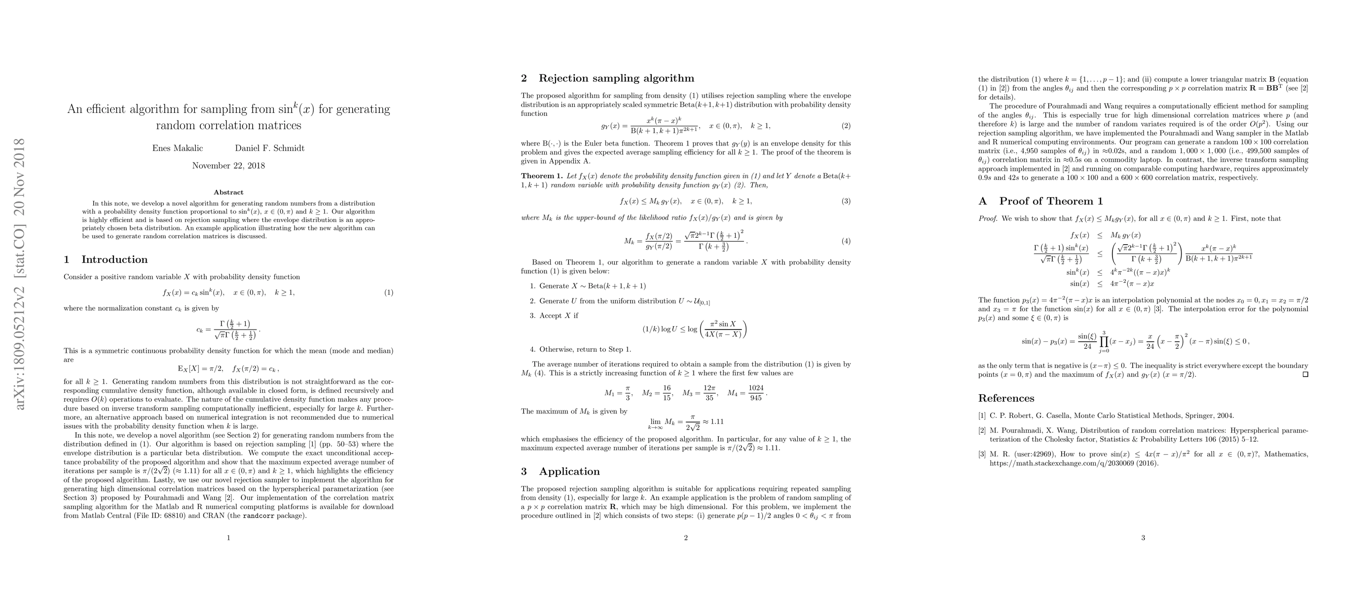 This paper introduces an efficient rejection sampling algorithm for generating random numbers from a distribution with a probability density proportional to $\sin^k(x)$ within $(0,\pi)$, and demonstrates its application in generating random correlation matrices.