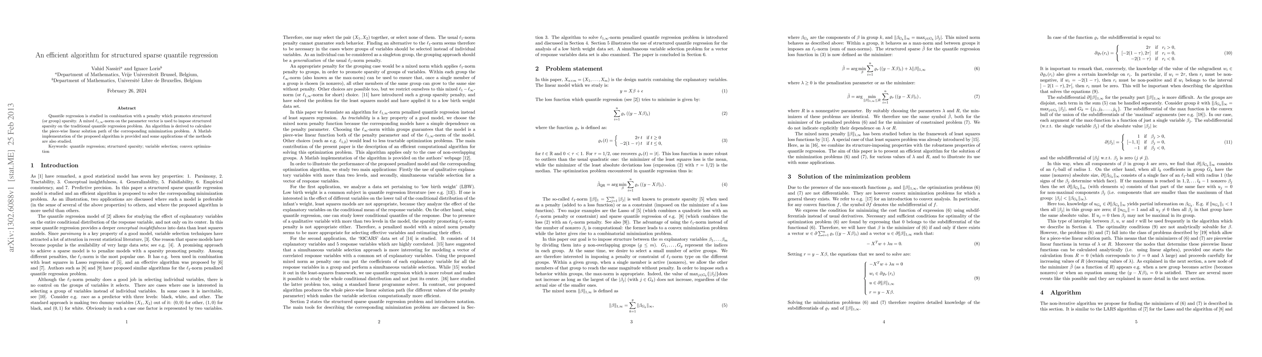 This paper proposes an efficient algorithm for structured sparse quantile regression using a mixed $\ell_{1,\infty}$-norm to enforce group sparsity. It derives a solution path for the optimization problem and provides a Matlab implementation for practical applications.