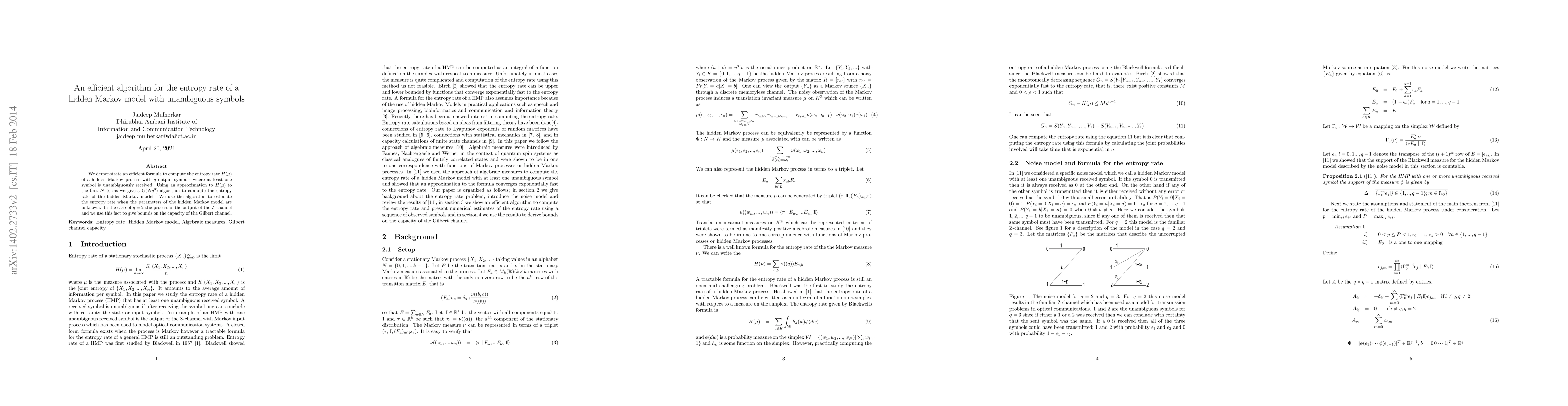 We demonstrate an efficient formula to compute the entropy rate $H(\mu)$ of a hidden Markov process with $q$ output symbols where at least one symbol is unambiguously received. Using an approximation to $H(\mu)$ to the first $N$ terms we give a $O(Nq^3$) algorithm to compute the entropy rate of the hidden Markov model. We use the algorithm to estimate the entropy rate when the parameters of the hidden Markov model are unknown.In the case of $q =2$ the process is the output of the Z-channel and we use this fact to give bounds on the capacity of the Gilbert channel.