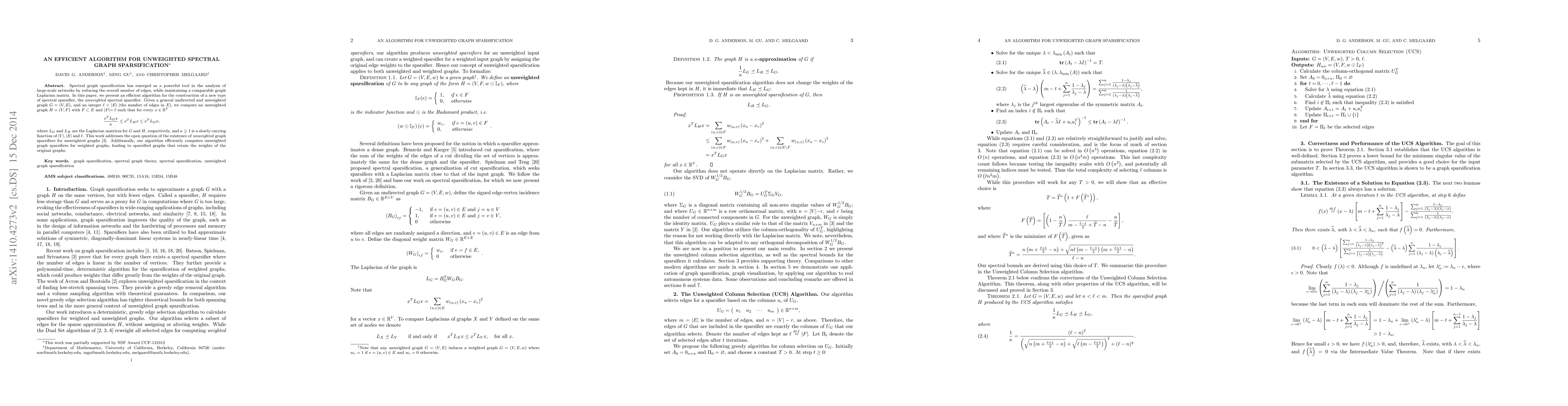 Spectral graph sparsification has emerged as a powerful tool in the analysis of large-scale networks by reducing the overall number of edges, while maintaining a comparable graph Laplacian matrix. In this paper, we present an efficient algorithm for the construction of a new type of spectral sparsifier, the unweighted spectral sparsifier. Given a general undirected and unweighted graph $G = (V, E)$ and an integer $\ell < |E|$ (the number of edges in $E$), we compute an unweighted graph $H = (V, F)$ with $F \subset E$ and $|F| = \ell$ such that for every $x \in \mathbb{R}^{V}$ \[ {\displaystyle \frac{x^T L_G x}{\kappa} \leq x^T L_H x \leq x^T L_G x,} \] where $L_G$ and $L_H$ are the Laplacian matrices for $G$ and $H$, respectively, and $\kappa \geq 1$ is a slowly-varying function of $|V|, |E|$ and $\ell$. This work addresses the open question of the existence of unweighted graph sparsifiers for unweighted graphs. Additionally, our algorithm can efficiently compute unweighted graph sparsifiers for weighted graphs, leading to sparsified graphs that retain the weights of the original graphs.