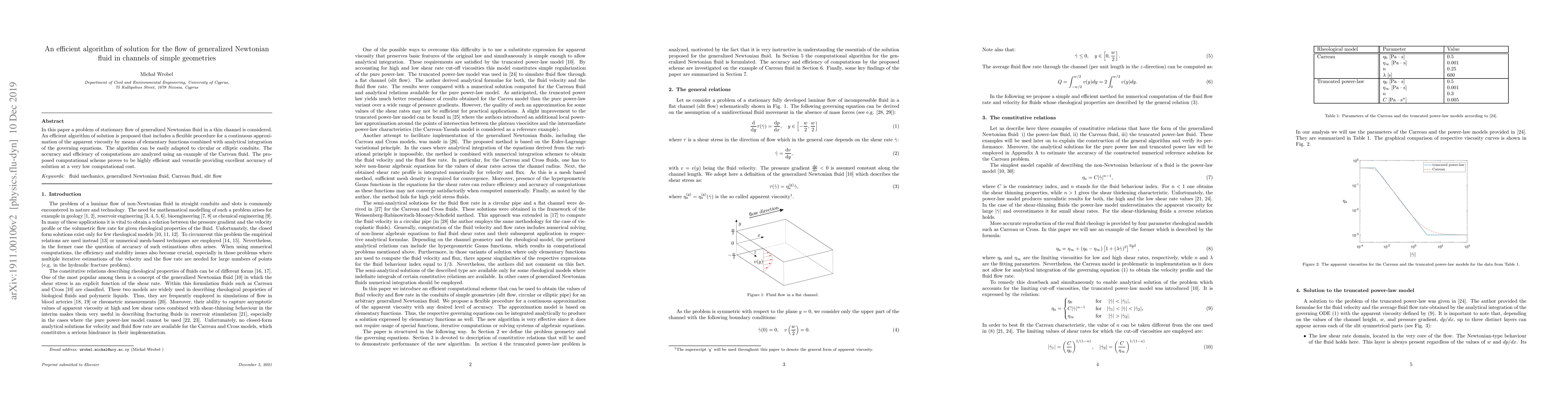 This paper proposes an efficient algorithm for solving the stationary flow of generalized Newtonian fluids in simple channel geometries, utilizing a flexible viscosity approximation and analytical integration. The method is demonstrated to be highly accurate and efficient, particularly for Carreau fluid, with low computational cost.
