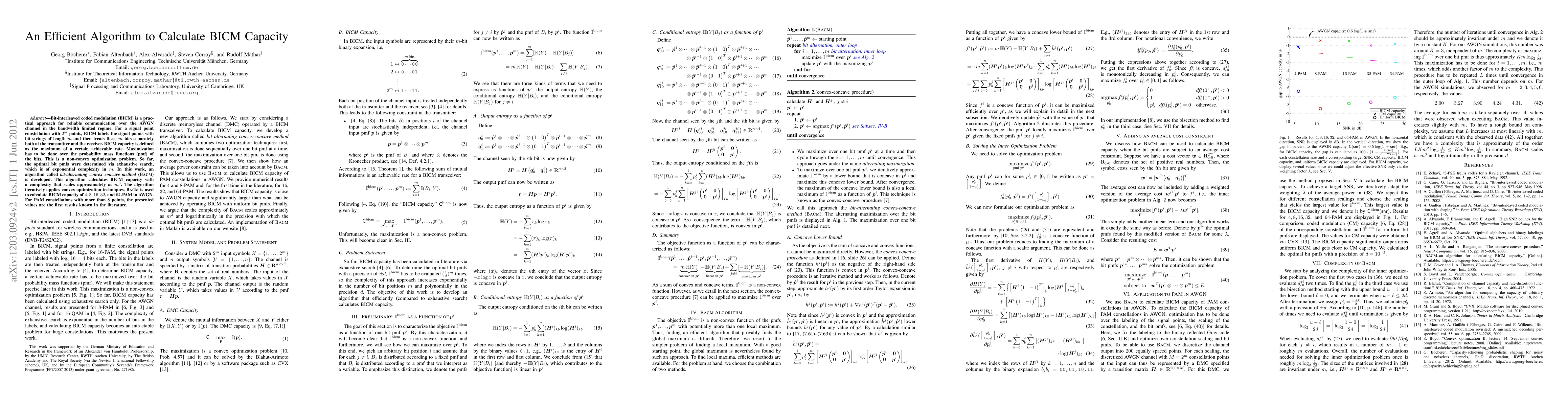 This paper introduces an efficient algorithm called bit-alternating convex concave method (BacM) to calculate the capacity of bit-interleaved coded modulation (BICM) over the AWGN channel, achieving a complexity of approximately m^3 compared to the exponential complexity of exhaustive search. The algorithm iteratively uses convex optimization techniques and provides new results for BICM capacity in larger PAM constellations.