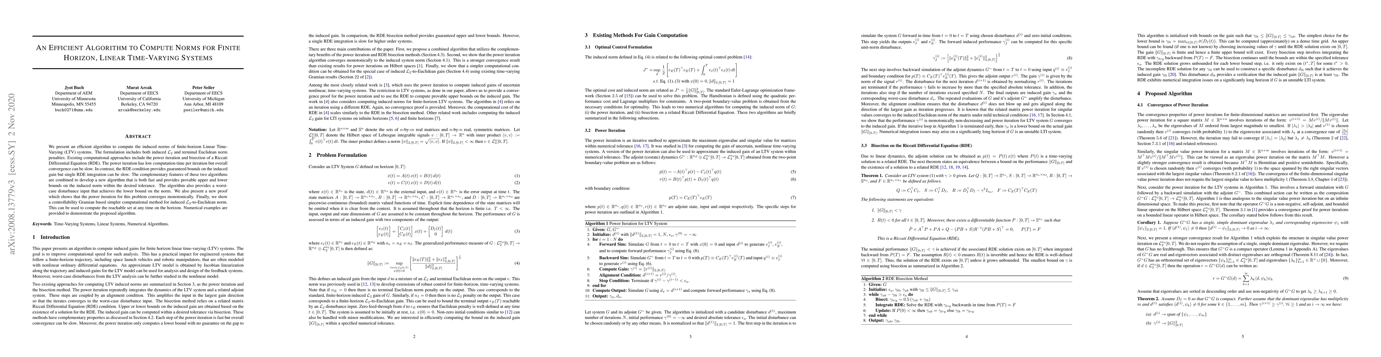 This paper introduces an efficient algorithm for computing induced norms of finite-horizon Linear Time-Varying systems, combining the strengths of power iteration and Riccati Differential Equation methods to achieve fast convergence and provable bounds. It also presents a simpler controllability Gramian-based method for $\mathcal{L}_2$-to-Euclidean norm computation.