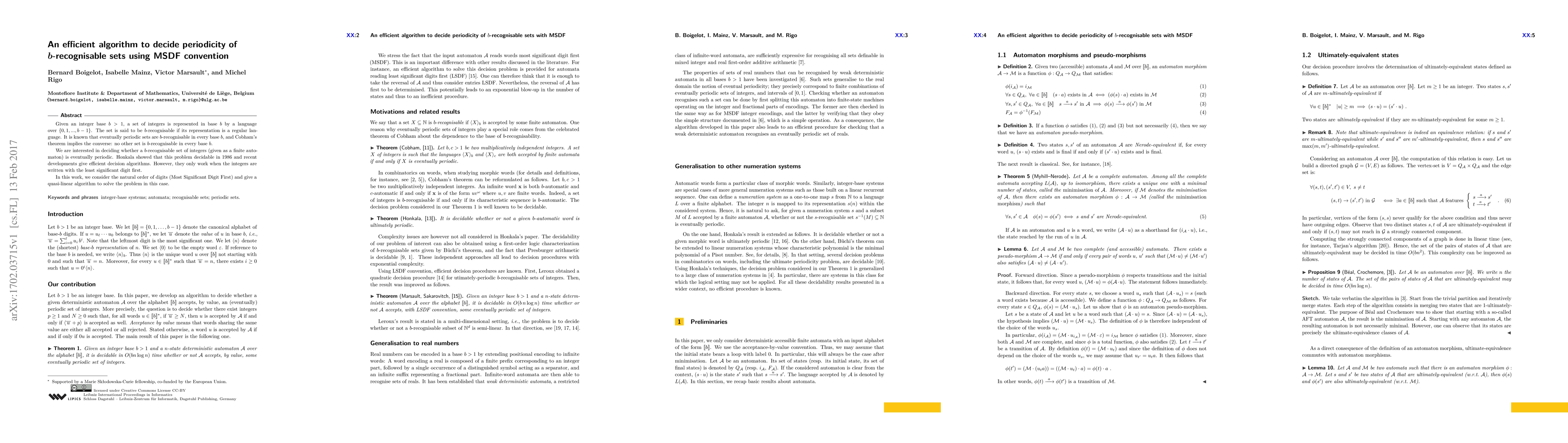 Given an integer base $b>1$, a set of integers is represented in base $b$ by a language over $\{0,1,...,b-1\}$. The set is said to be $b$-recognisable if its representation is a regular language. It is known that eventually periodic sets are $b$-recognisable in every base $b$, and Cobham's theorem implies the converse: no other set is $b$-recognisable in every base $b$. We are interested in deciding whether a $b$-recognisable set of integers (given as a finite automaton) is eventually periodic. Honkala showed that this problem decidable in 1986 and recent developments give efficient decision algorithms. However, they only work when the integers are written with the least significant digit first. In this work, we consider the natural order of digits (Most Significant Digit First) and give a quasi-linear algorithm to solve the problem in this case.