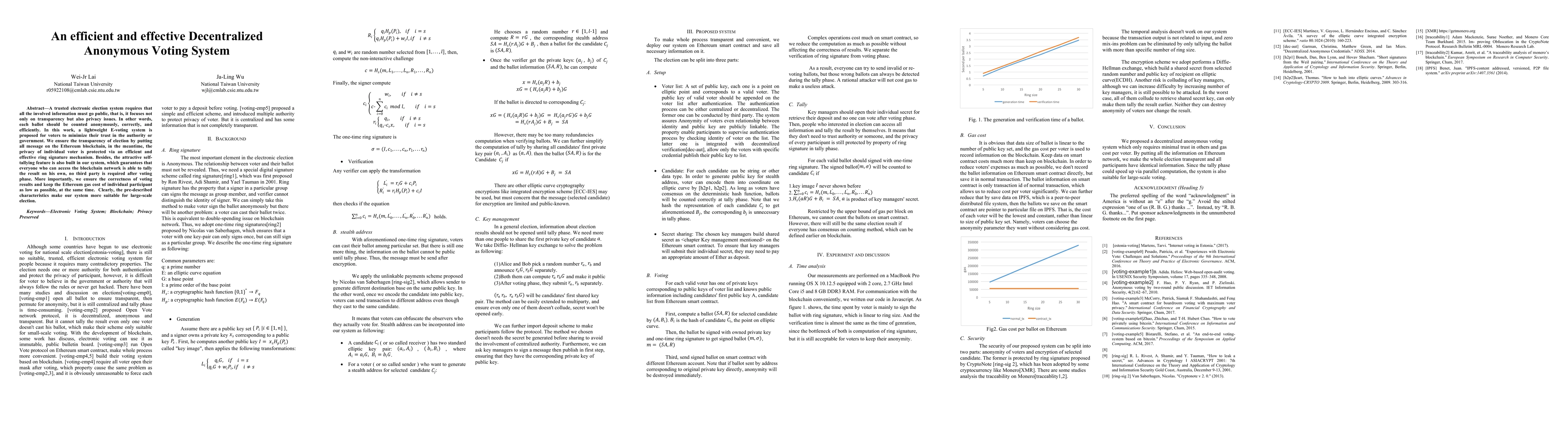 A trusted electronic election system requires that all the involved information must go public, that is, it focuses not only on transparency but also privacy issues. In other words, each ballot should be counted anonymously, correctly, and efficiently. In this work, a lightweight E-voting system is proposed for voters to minimize their trust in the authority or government. We ensure the transparency of election by putting all message on the Ethereum blockchain, in the meantime, the privacy of individual voter is protected via an efficient and effective ring signature mechanism. Besides, the attractive self-tallying feature is also built in our system, which guarantees that everyone who can access the blockchain network is able to tally the result on his own, no third party is required after voting phase. More importantly, we ensure the correctness of voting results and keep the Ethereum gas cost of individual participant as low as possible, at the same time. Clearly, the pre-described characteristics make our system more suitable for large-scale election.