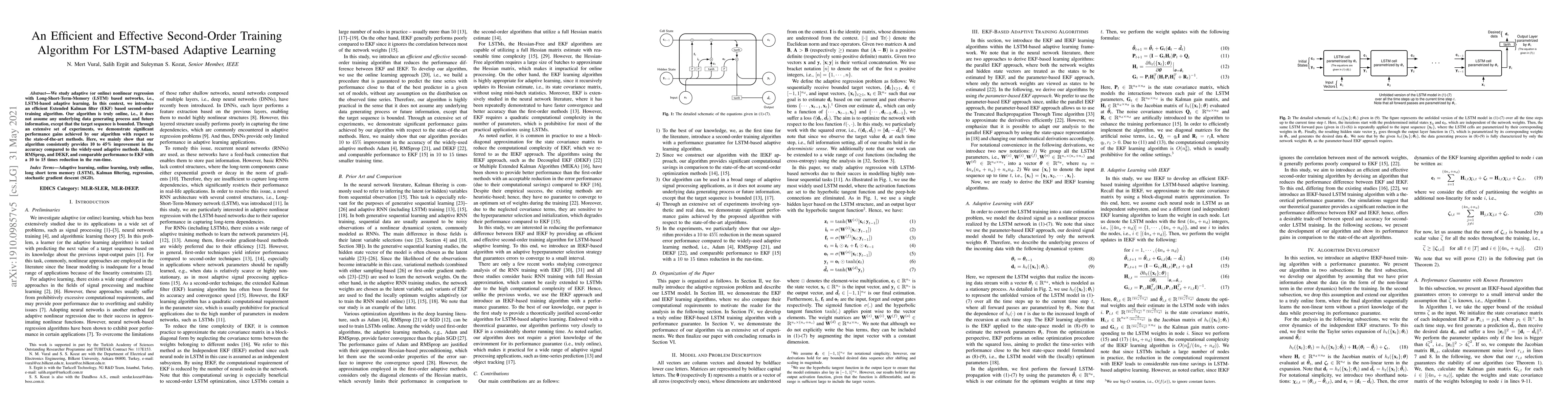 This paper introduces an efficient second-order training algorithm based on the Extended Kalman filter for LSTM-based adaptive learning, demonstrating significant performance gains and up to 45% improvement in accuracy compared to state-of-the-art adaptive methods, while reducing run-time by 10 to 15 times.