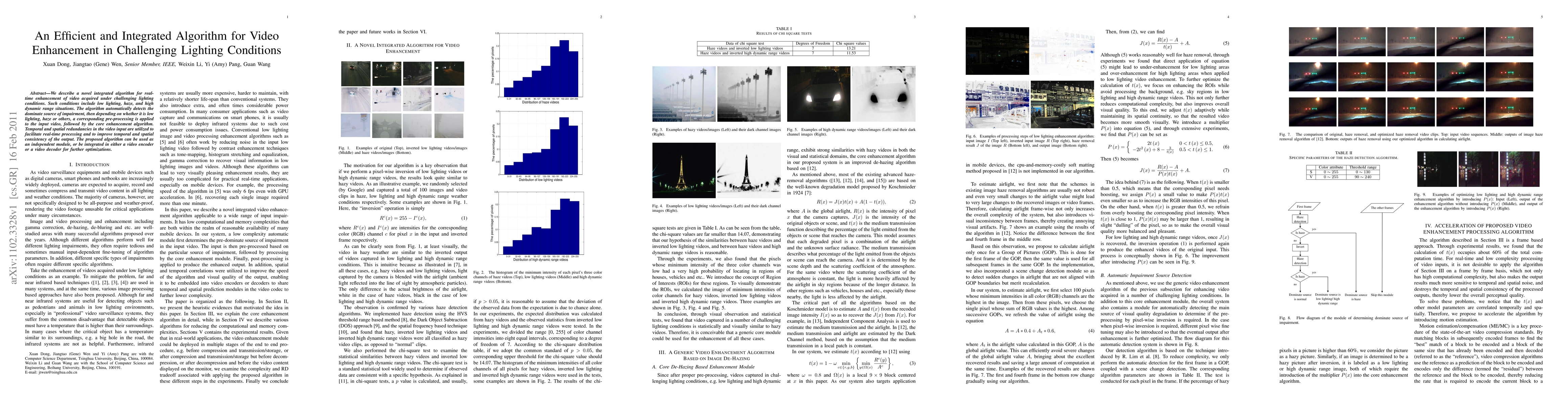This paper presents an integrated algorithm for real-time video enhancement under challenging lighting conditions, including low lighting and haze. It automatically detects impairments and applies tailored pre-processing before enhancing the video, leveraging temporal and spatial redundancies for real-time processing and improved consistency.