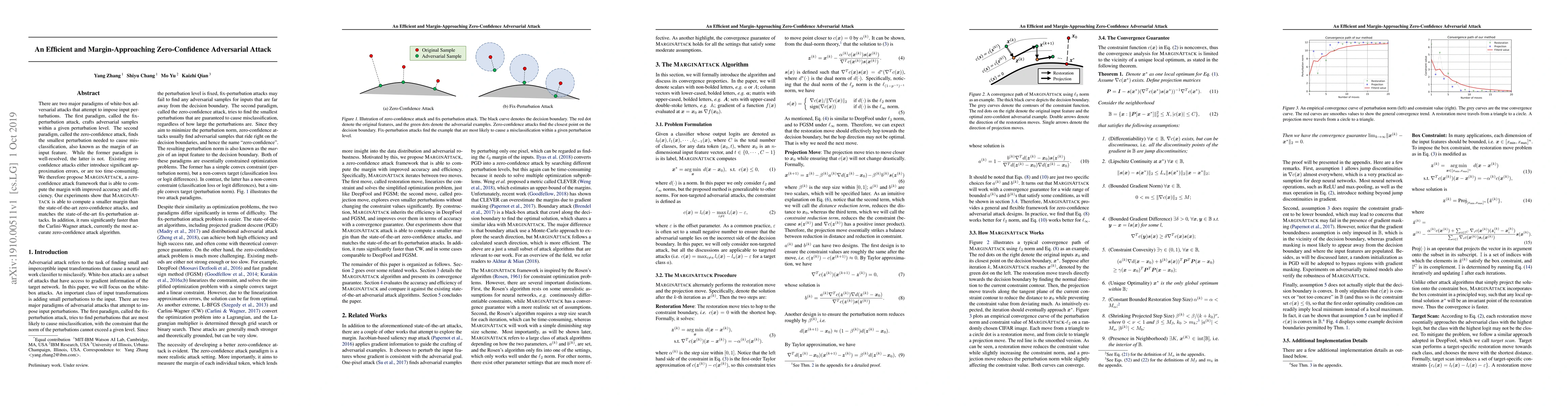There are two major paradigms of white-box adversarial attacks that attempt to impose input perturbations. The first paradigm, called the fix-perturbation attack, crafts adversarial samples within a given perturbation level. The second paradigm, called the zero-confidence attack, finds the smallest perturbation needed to cause mis-classification, also known as the margin of an input feature. While the former paradigm is well-resolved, the latter is not. Existing zero-confidence attacks either introduce significant ap-proximation errors, or are too time-consuming. We therefore propose MARGINATTACK, a zero-confidence attack framework that is able to compute the margin with improved accuracy and efficiency. Our experiments show that MARGINATTACK is able to compute a smaller margin than the state-of-the-art zero-confidence attacks, and matches the state-of-the-art fix-perturbation at-tacks. In addition, it runs significantly faster than the Carlini-Wagner attack, currently the most ac-curate zero-confidence attack algorithm.