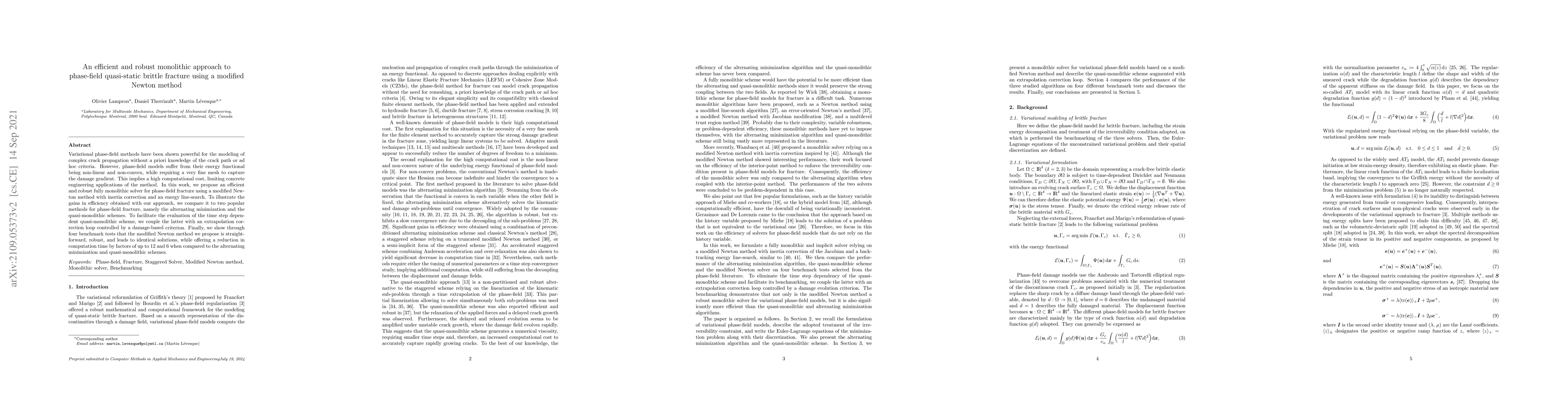This paper proposes an efficient monolithic solver for phase-field quasi-static brittle fracture using a modified Newton method with inertia correction and energy line-search, demonstrating significant reductions in computation time compared to alternating minimization and quasi-monolithic schemes. The approach is shown to be robust and offers up to a 12-fold reduction in computation time.