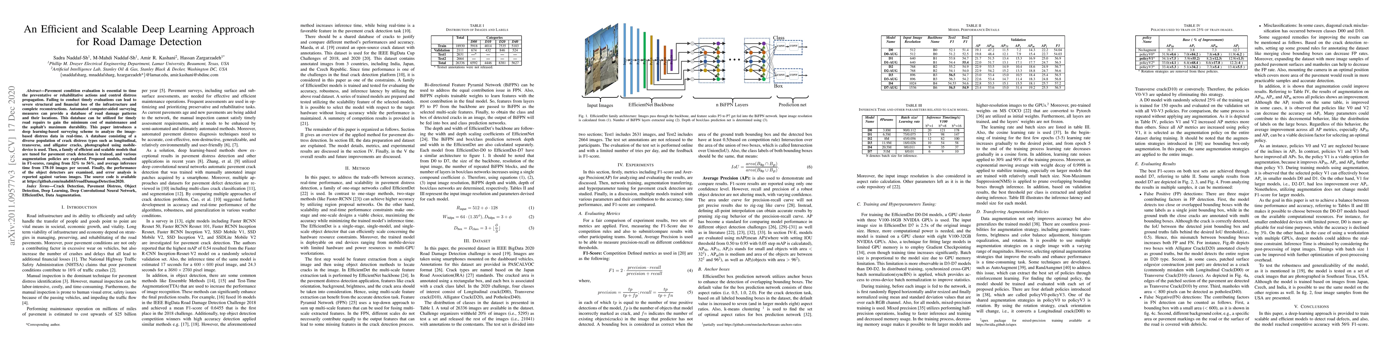 Pavement condition evaluation is essential to time the preventative or rehabilitative actions and control distress propagation. Failing to conduct timely evaluations can lead to severe structural and financial loss of the infrastructure and complete reconstructions. Automated computer-aided surveying measures can provide a database of road damage patterns and their locations. This database can be utilized for timely road repairs to gain the minimum cost of maintenance and the asphalt's maximum durability. This paper introduces a deep learning-based surveying scheme to analyze the image-based distress data in real-time. A database consisting of a diverse population of crack distress types such as longitudinal, transverse, and alligator cracks, photographed using mobile-device is used. Then, a family of efficient and scalable models that are tuned for pavement crack detection is trained, and various augmentation policies are explored. Proposed models, resulted in F1-scores, ranging from 52% to 56%, and average inference time from 178-10 images per second. Finally, the performance of the object detectors are examined, and error analysis is reported against various images. The source code is available at https://github.com/mahdi65/roadDamageDetection2020.