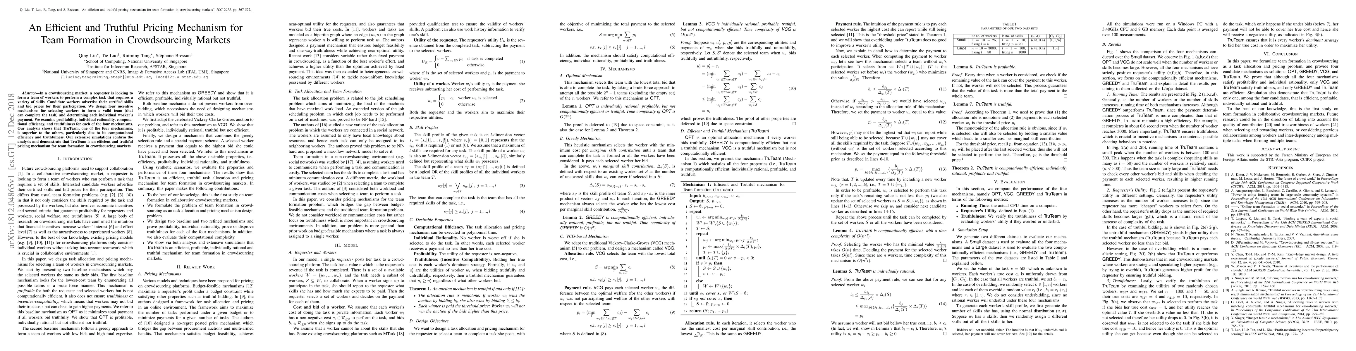A new pricing mechanism called TruTeam is proposed for team formation in crowdsourcing markets, offering superior computational efficiency and truthfulness while ensuring individual rationality and profitability.