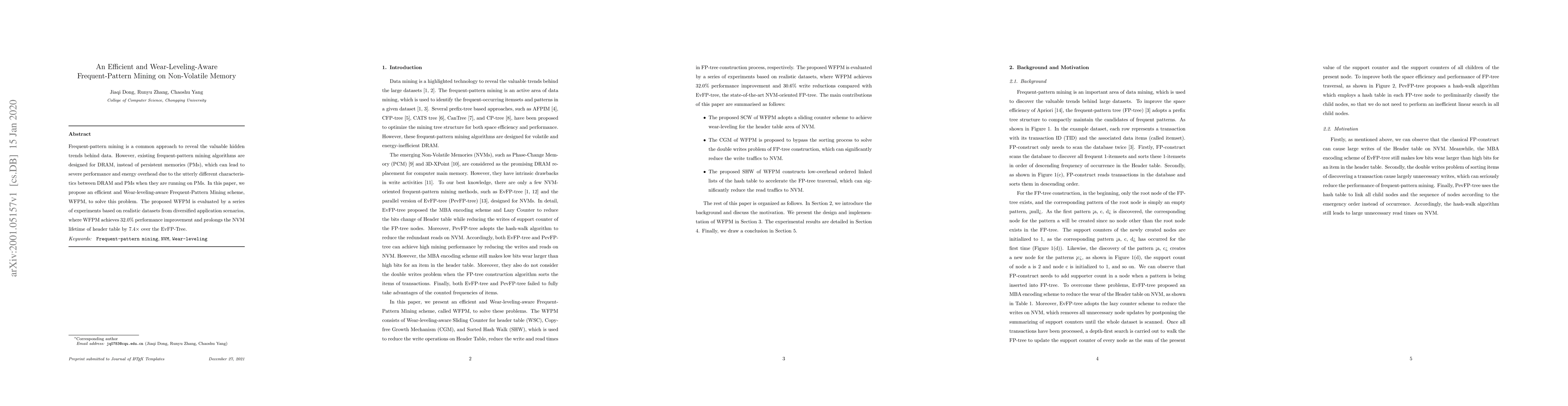 This paper proposes an efficient and wear-leveling-aware Frequent-Pattern Mining scheme, WFPM, tailored for non-volatile memory (NVM) to address performance and energy inefficiencies of traditional DRAM-based algorithms. Experimental results show WFPM achieves a 32.0% performance boost and extends NVM lifetime by 7.4x compared to EvFP-Tree.