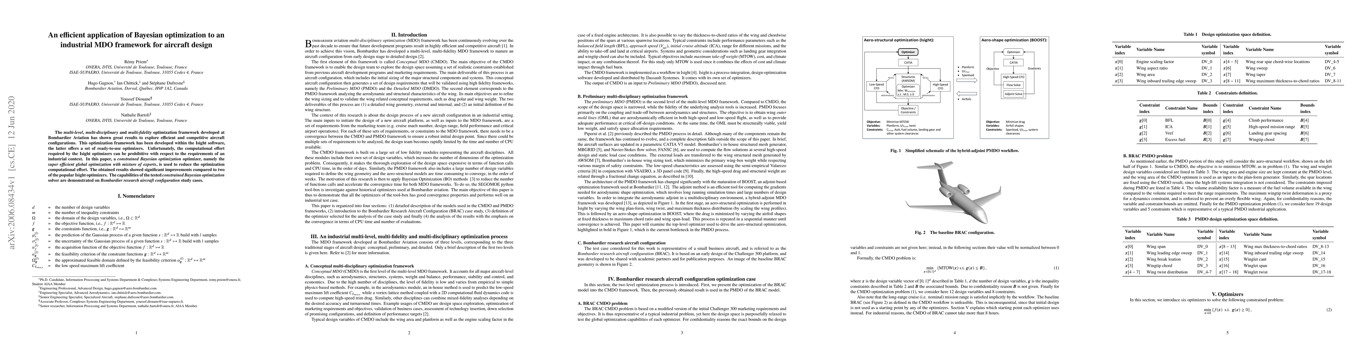 The multi-level, multi-disciplinary and multi-fidelity optimization framework developed at Bombardier Aviation has shown great results to explore efficient and competitive aircraft configurations. This optimization framework has been developed within the Isight software, the latter offers a set of ready-to-use optimizers. Unfortunately, the computational effort required by the Isight optimizers can be prohibitive with respect to the requirements of an industrial context. In this paper, a constrained Bayesian optimization optimizer, namely the super efficient global optimization with mixture of experts, is used to reduce the optimization computational effort. The obtained results showed significant improvements compared to two of the popular Isight optimizers. The capabilities of the tested constrained Bayesian optimization solver are demonstrated on Bombardier research aircraft configuration study cases.