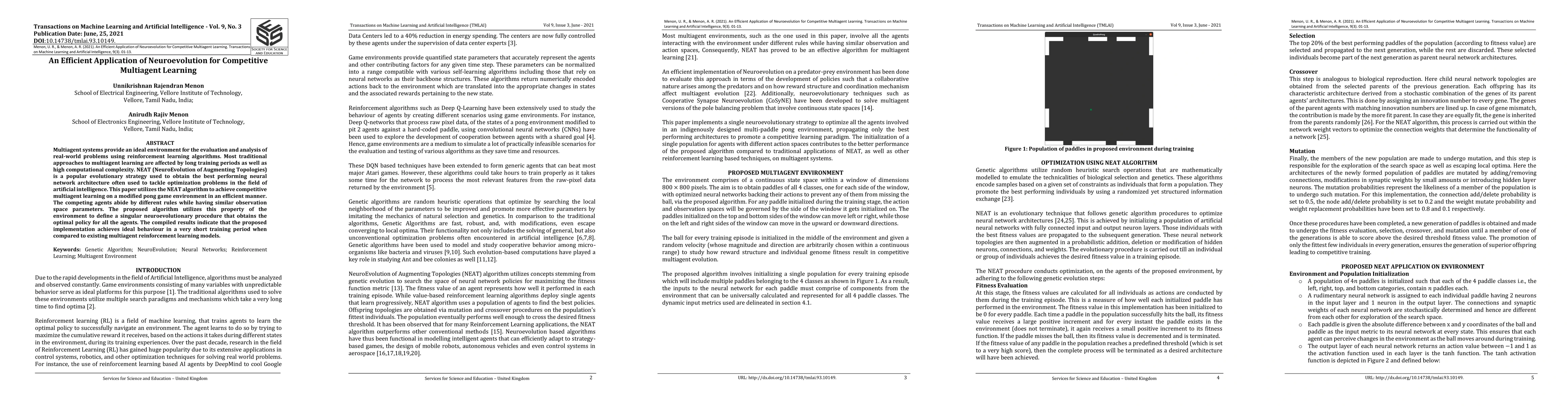This paper applies the NEAT algorithm for efficient neuroevolution in competitive multiagent learning, demonstrating its effectiveness in a modified pong game environment. The proposed method achieves optimal policies for all agents in a significantly shorter training period compared to traditional multiagent reinforcement learning models.
